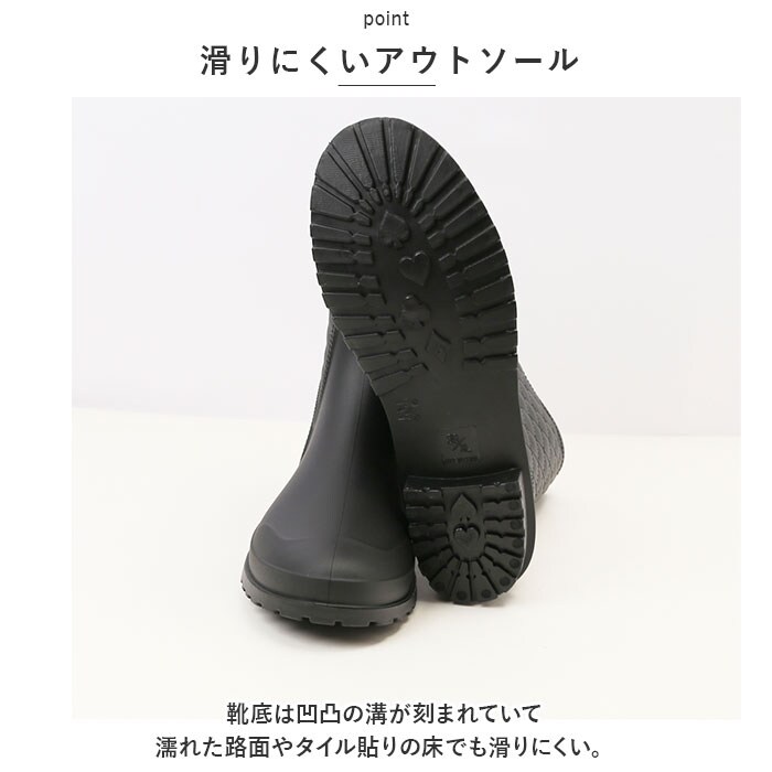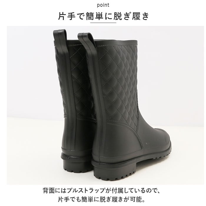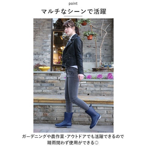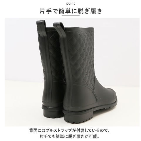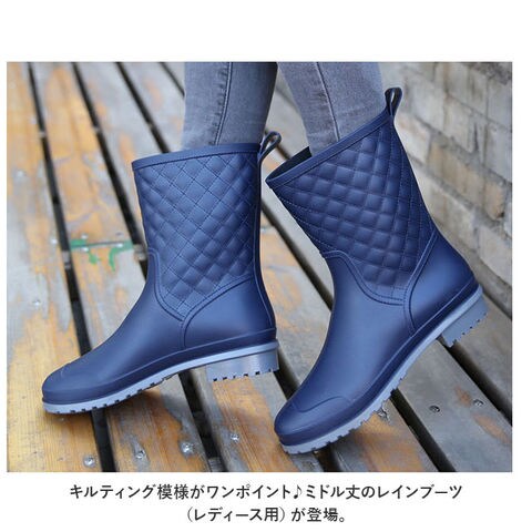 | 商品説明 | キルティング模様がワンポイント♪ミドル丈のレインブーツ(レディース用)が登場。【マルチなシーンで活躍】ガーデニングや農作業・アウトドアでも活躍できるので、晴雨問わず使用ができる◎【片手で簡単に脱ぎ履き】背面にはプルストラップが付属しているので、片手でも簡単に脱ぎ履きが可能。【滑りにくいアウトソール】靴底は凹凸の溝が刻まれていて、濡れた路面やタイル貼りの床でも滑りにくい。ベーシックなブラックとネイビーカラーを使用。シンプルなデザインでコーデに合わせやすいのも魅力的♪ |