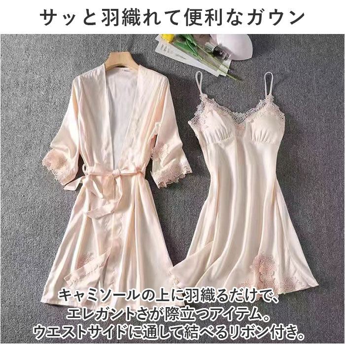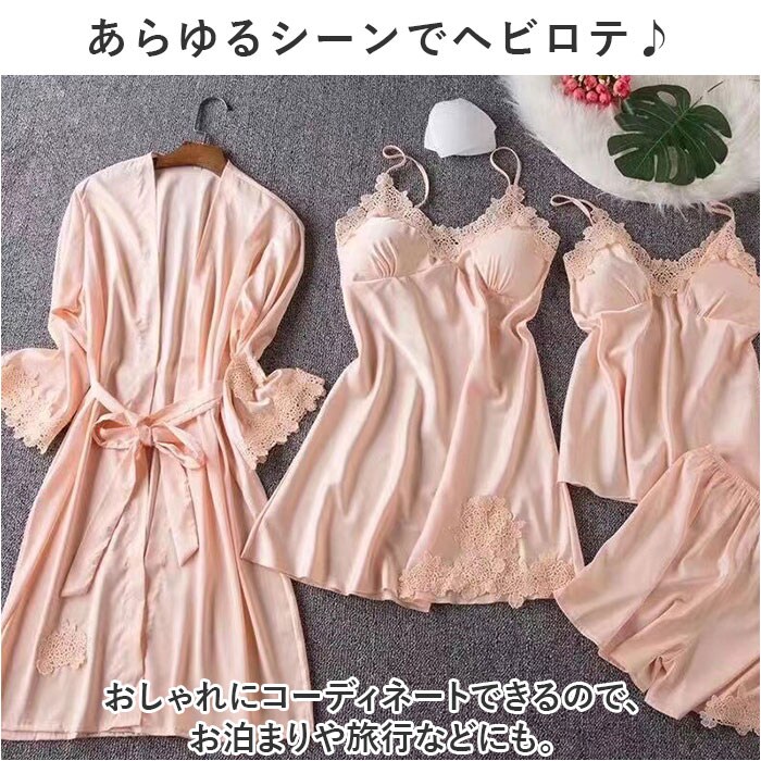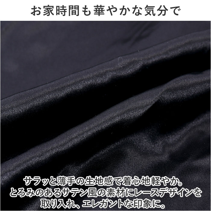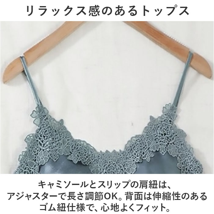 | 商品説明 | お家の中でもおしゃれに♪大人女子にぴったりのルームウェア5点セットが登場。【組み合わせ自在の5点セット】ガウン、キャミソール、スリップ、ショートパンツ、ロングパンツの5点セット。気分や気温に合わせて、自由に組み合わせOK。【お家時間も華やかな気分で】サラッと薄手の生地感で着心地軽やか。とろみのあるサテン風の素材にレースデザインを取り入れ、エレガントな印象に。【リラックス感のあるトップス】キャミソールとスリップの肩紐は、アジャスターで長さ調節OK。背面は伸縮性のあるゴム紐仕様で、心地よくフィット。【バストのカタチをふんわりキープ】安心のパッドが付属。取り外しができるから、お洗濯時の型崩れの心配が不要。【サッと羽織れて便利なガウン】キャミソールの上に羽織るだけで、エレガントさが際立つアイテム。ウエストサイドに通して結べるリボン付き。【着脱ラクチンな2つのパンツ】締めつけ感がなく、着脱しやすいウエストゴムタイプ。汗ばむ季節にうれしいショート丈と、冷房対策にも最適なロング丈。【あらゆるシーンでヘビロテ♪】おしゃれにコーディネートできるので、お泊まりや旅行などにも。 |