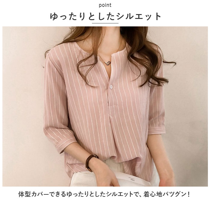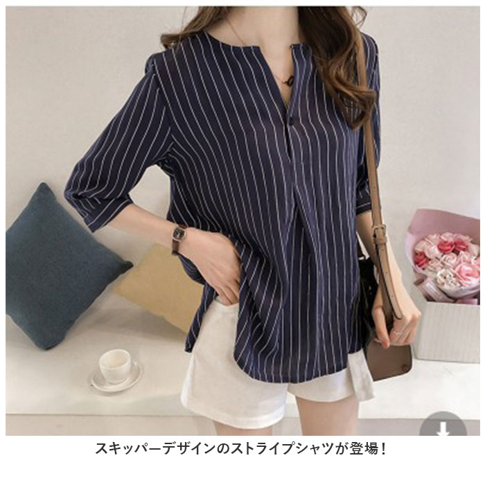 | 商品説明 | スキッパーデザインのストライプシャツが登場!【スキッパーデザイン】スキッパーデザインのVネックで襟元が大きく開き、デコルテをすっきり、フェミニンな印象に!【胸元に隠しボタン】Vネックの胸元には隠しボタンがついているので、胸元が開きすぎる心配なし。【ゆったりとしたシルエット】体型カバーできるゆったりとしたシルエットで、着心地バツグン!【シンプルなストライプ柄】シンプルなストライプ柄でオフィスやカジュアルコーデにも大活躍! |