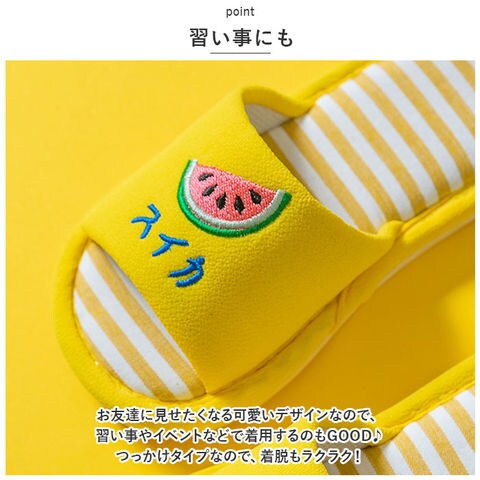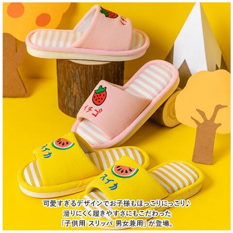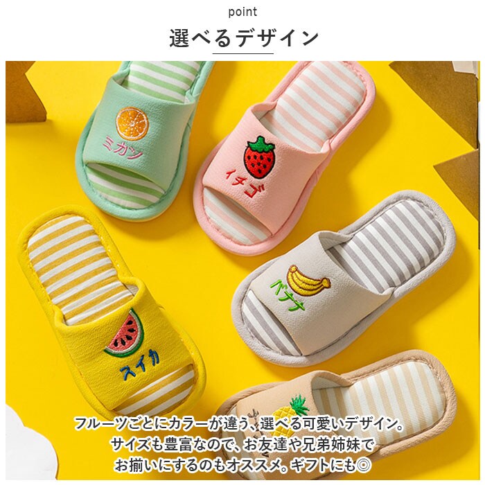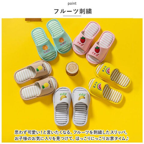 | 商品説明 | 可愛すぎるデザインでお子様もほっこりにっこり♪滑りにくく履きやすさにもこだわった「子供用 スリッパ 男女兼用」が登場。【フルーツ刺繍】思わず可愛い!と言いたくなる、フルーツを刺繍したスリッパ。お子様のお気に入りを見つけて、ほっこりにっこりお家タイム♪【柔らかインソール】インソール部分はクッション性が高く、履き心地ふっくら。疲れにくい仕様なので、お家でのリラックスタイムにもぴったり。脱いだ時にもちゃんと可愛い、ボーダー柄も嬉しいポイント♪【コットンリネン】コットンリネンを使用した生地。サラっとした肌触りで履き心地なめらか。通気性に優れ、ムレが気になる足元も快適。【滑りにくい靴底】靴底は滑りにくい素材なので、室内や階段などの歩行も安心◎【屈曲性のあるソール】足の動きに合わせ屈曲する、柔らかいソール部分。お子様のアクティブな動きもOK。動きやすさに配慮したアイテム。【習い事にも】お友達に見せたくなる可愛いデザインなので、習い事やイベントなどで着用するのもGOOD♪つっかけタイプなので、着脱もラクラク!【選べるデザイン】フルーツごとにカラーが違う、選べる可愛いデザイン。サイズも豊富なので、お友達や兄弟姉妹でお揃いにするのもオススメ。ギフトにも◎ |
