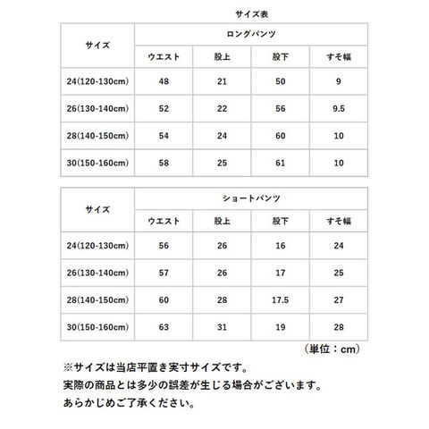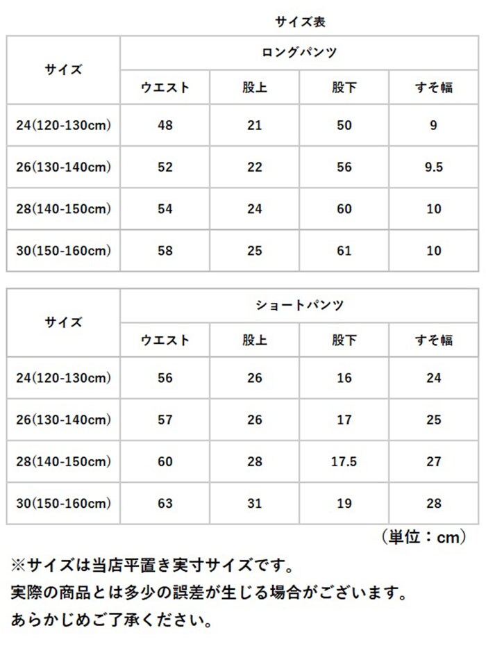 | 重量 | 約137g ※28(140-150cm)のショートパンツの重量です。 |