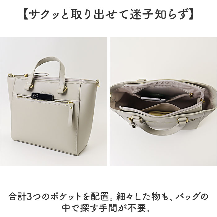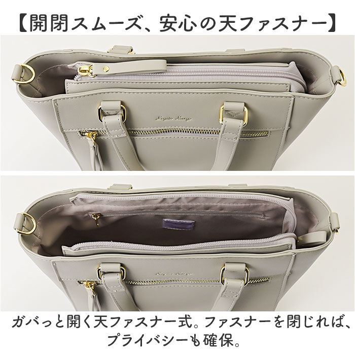 | 商品説明 | 【いつものコーデがワンランクアップ】優雅で上品な雰囲気をプラス♪「Legato Largo ブライトバッグ2WAYトート」。【大人の魅力を引き立てるブライト】働く女性をいきいきと輝かせてくれるシリーズ。程よい光沢感と華やかな金具使いがポイント。【お好みに合わせてスタイルチェンジ】手持ちで♪長さ調節可能なショルダーを取り付け、肩掛けや斜め掛けも自在な2WAY!【シルエットを保って実用性も叶える】ハンドルは倒せる仕様で、型崩れもしにくく使い勝手抜群。荷物を入れていない状態でも自立。【開閉スムーズ、安心の天ファスナー】ガバっと開く天ファスナー式。ファスナーを閉じれば、プライバシーも確保。【A5対応ですっきりひとまとめ】A5や500mlペットボトルが横向きに。コンパクトに見えて、必要な物はしっかりと収納。【サクッと取り出せて迷子知らず】合計3つのポケットを配置。細々した物も、バッグの中で探す手間が不要。【面倒なお手入れいらずで手軽に】手触り柔らかなPU素材。特別なお手入れは必要なく汚れなどは拭き取るだけ。デイリーに活躍。【飽きが来ず長く愛用できるアイテム】トレンドに左右されず、オールシーズン使える☆コーデに馴染むシンプルデザイン。【ポケット仕様】内側:オープンポケット×1、ファスナーポケット×1前面:ファスナーポケット×1 |