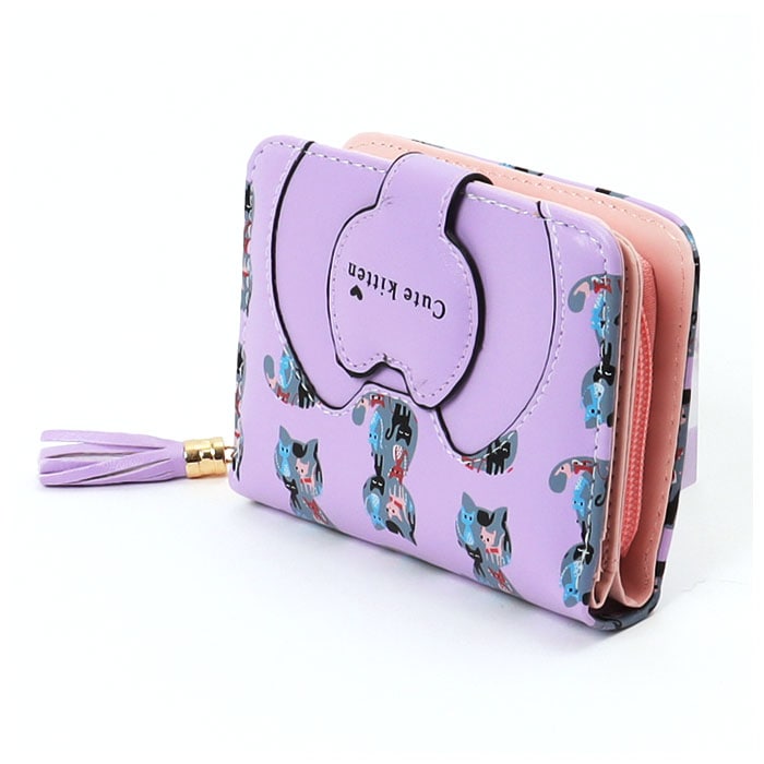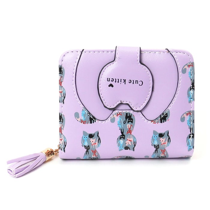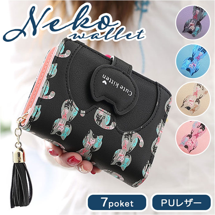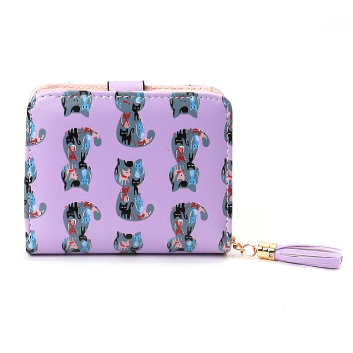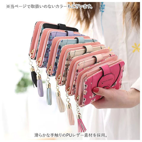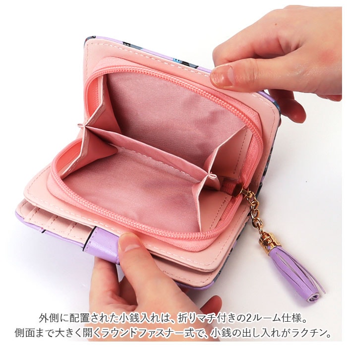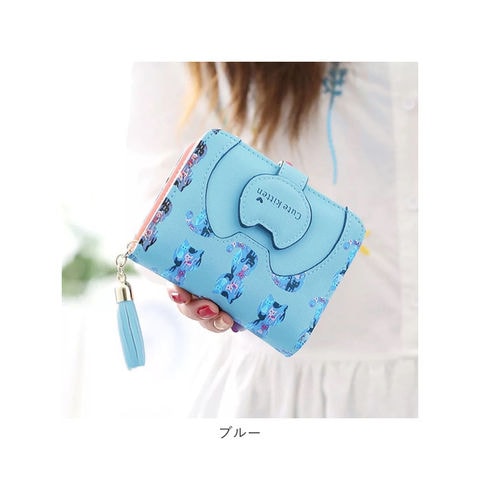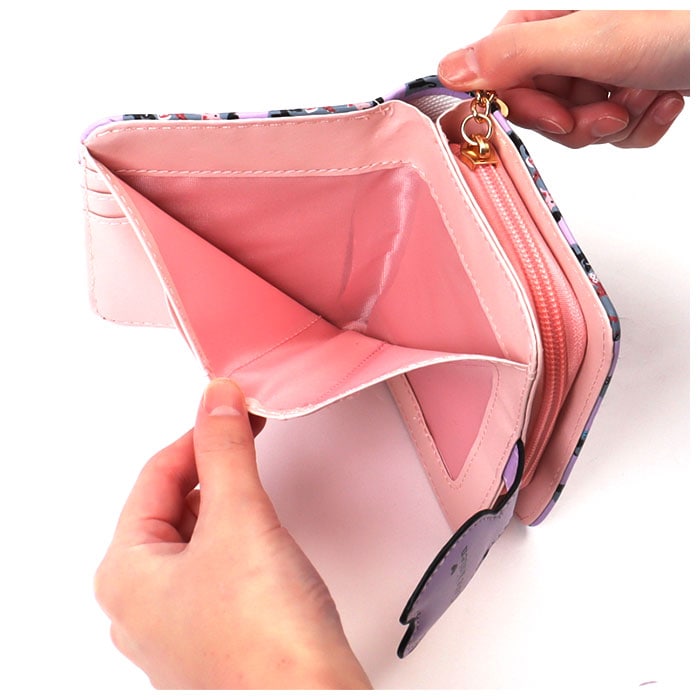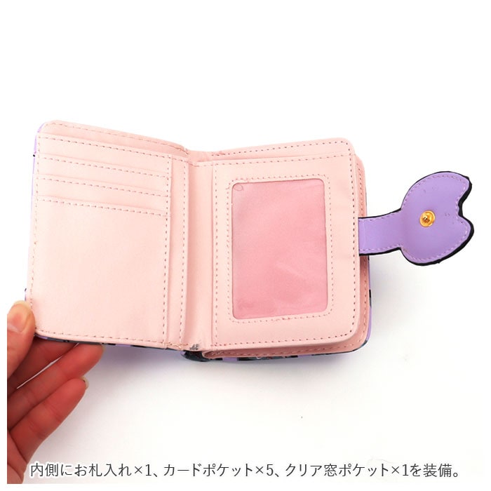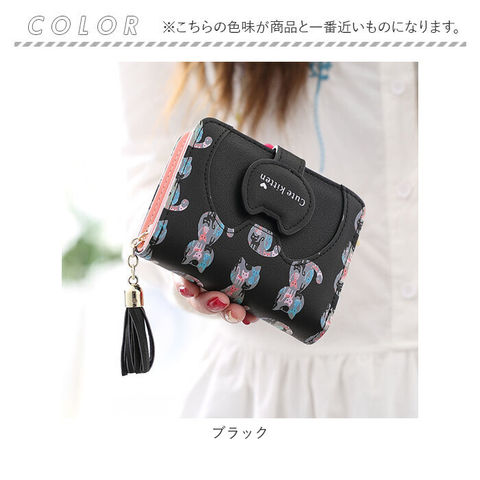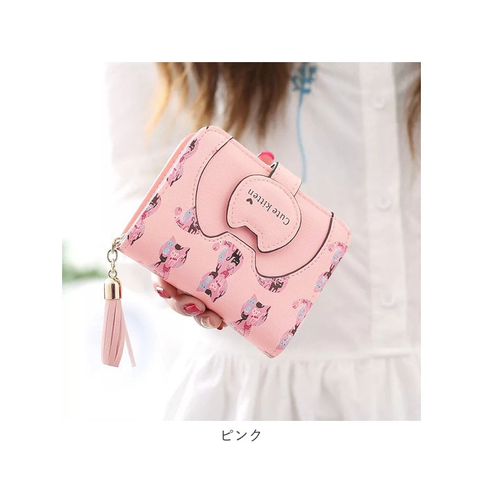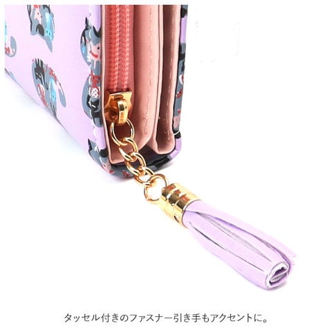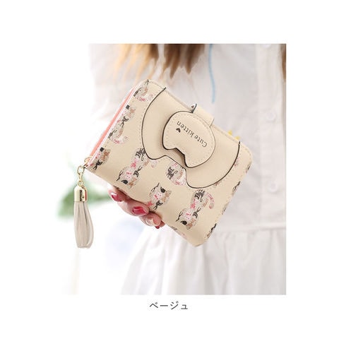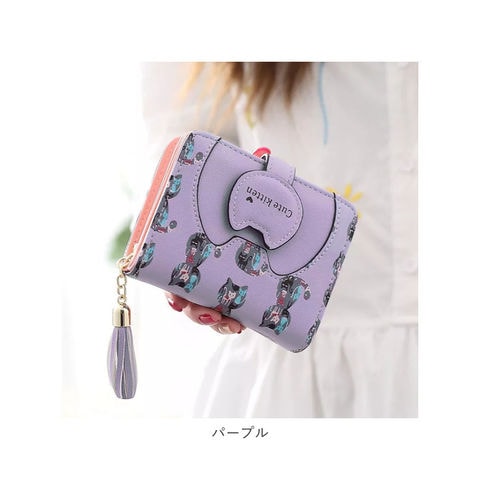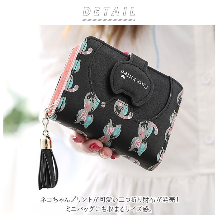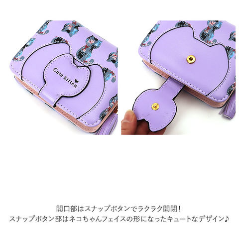 | 商品説明 | ネコちゃんプリントが可愛い二つ折り財布が発売!滑らかな手触りのPUレザー素材を採用。ミニバッグにも収まるサイズ感。開口部はスナップボタンでラクラク開閉!スナップボタン部はネコちゃんフェイスの形になっており、よりキュートなデザインに♪内側にお札入れ×1、カードポケット×5、クリア窓ポケット×1を装備。外側に配置された小銭入れは、折りマチ付きの2ルーム仕様。側面まで大きく開くラウンドファスナー式で、小銭の出し入れがラクチン。タッセル付きのファスナー引き手もアクセントに。 |