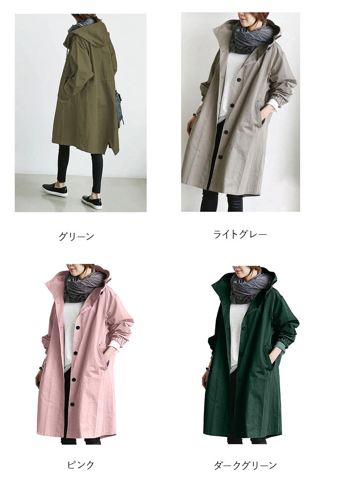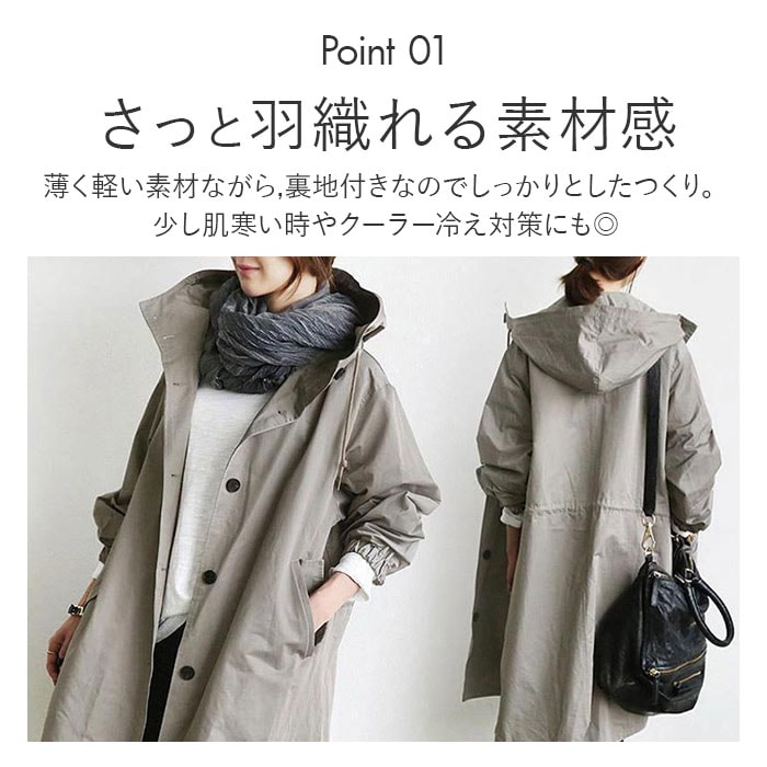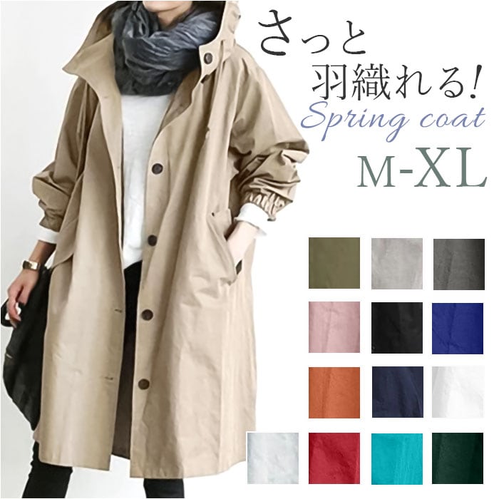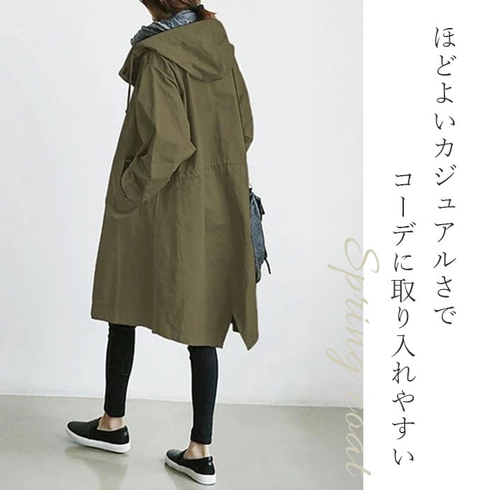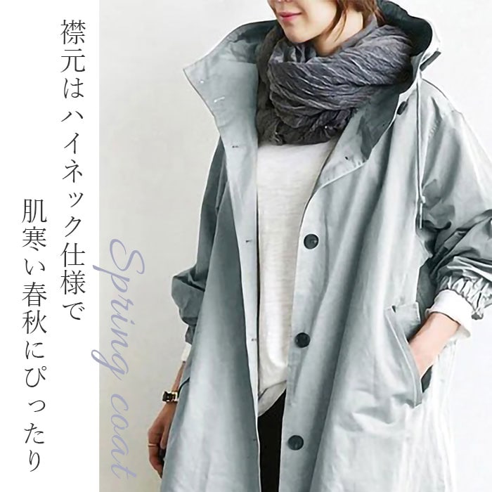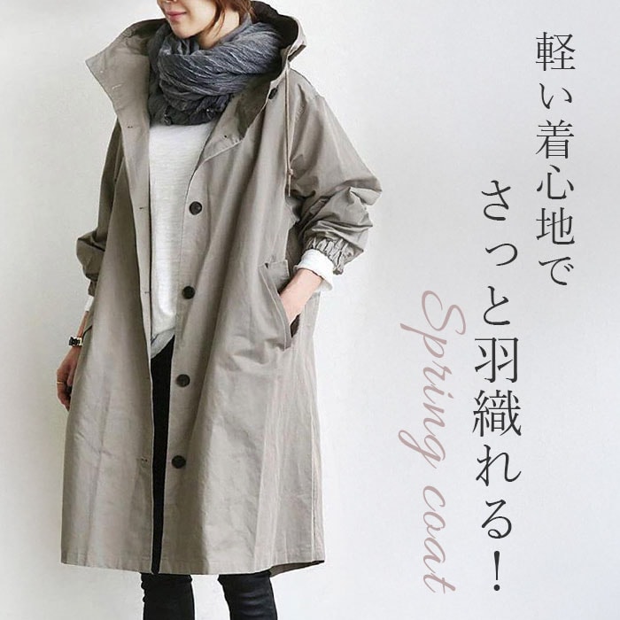 | 商品説明 | 春秋に大活躍!シルエットがカッコイイ薄手のトレンチコートが登場。【ゆったりと羽織れる】薄く軽い素材で作られているけど、裏地付きなのでしっかりとしたつくり。ゆったりと羽織れるので、春や秋など少し肌寒い時や夏場の通勤時のクーラー冷え対策にも◎【便利な機能多彩♪】両サイドにはあると便利なポケット付き。袖口はゴム使用で伸縮性あり、フード部分は紐で調節可能。【自分スタイルに♪】背面裾にはスリットがあり、ウェスト部分内側には調節紐付きで好みの形に絞れる作りで自分スタイルに♪【優秀アイテム!】首回りがハイネック仕様でシルエットがカッコイイ。大人っぽいシンプルなカラーバリエーションでカジュアルにもキレイめファッションにも着まわせる優秀なアイテム! |