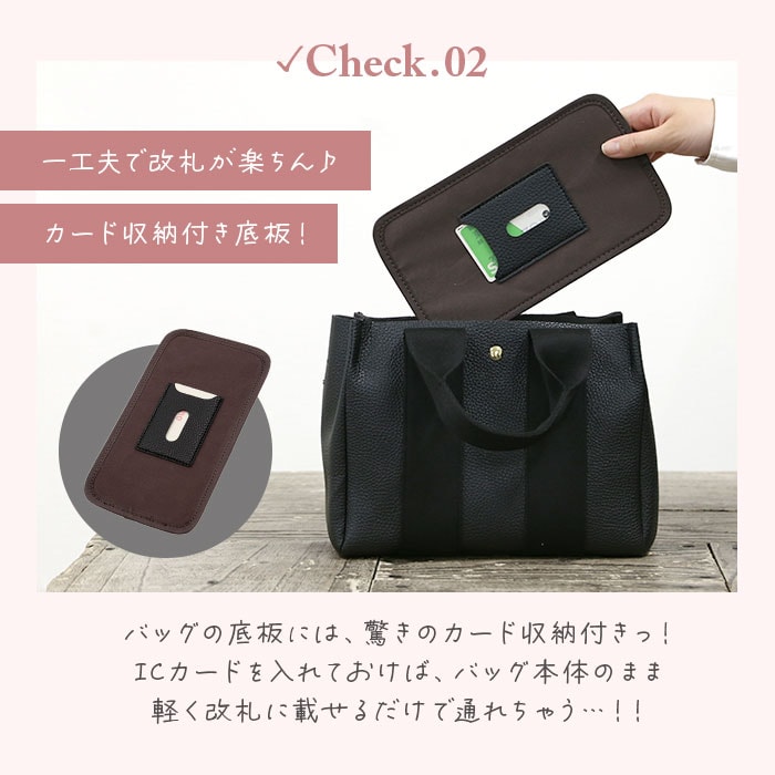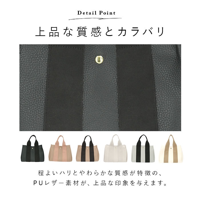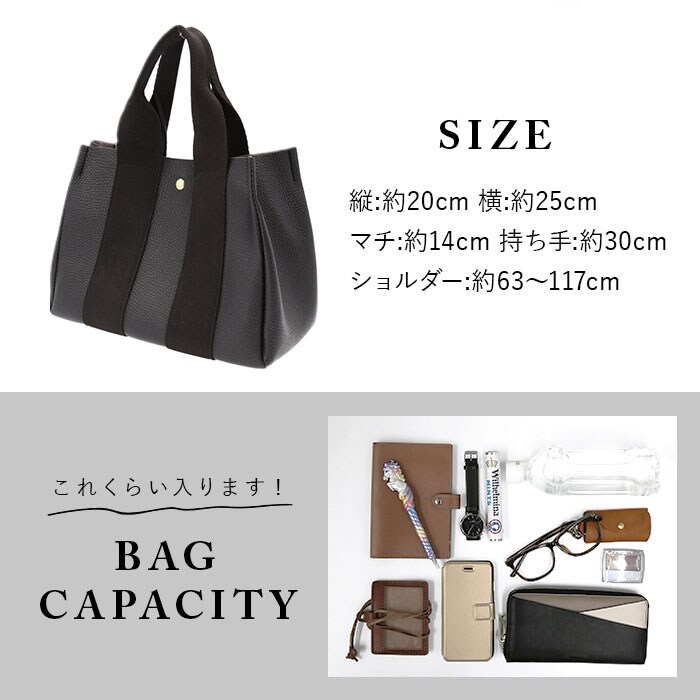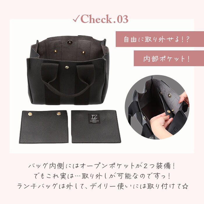 | 商品説明 | 大人女子に人気のLIZ DAYSから、2WAYトートバッグ(Sサイズ)が登場。本革のようなシボ加工を施したバッグ生地にコットンテープハンドルを組み合わせた、カジュアルになりすぎないデザインがおしゃれ♪メインは長財布やA5サイズのノートがはいる大きさ。お弁当箱もすっぽり入るマチ幅なので、ランチトートとして使うのもおススメ!内側にある2つのオープンポケットは、スナップボタンで取り外しが可能。上部のスナップボタンで留めれば、バッグのフタに!中身がこぼれ落ちにくく、プライバシーも確保。付属のポーチにもオープンポケット×2とファスナーポケットが内側に付いており、コスメ等の小物を入れるポーチ単体としても使える!メインに付属のポーチをインして使えば、中が丸見えにならず、何がどこにあるのか一目でわかりやすいのもポイント◎取り外し可能な底板には、ICカードポケットを装備!ICカードを入れてバッグの底を改札機にかざせば、改札をスマートに通過できちゃう♪手持ちではもちろん、長さ調節可能なショルダーベルトを取り付けてショルダーバッグとしても使える2way仕様。マチと底鋲があり自立する使いやすさ抜群のトートバッグ◎通勤・通学、普段のお出かけなど幅広く活躍。 |