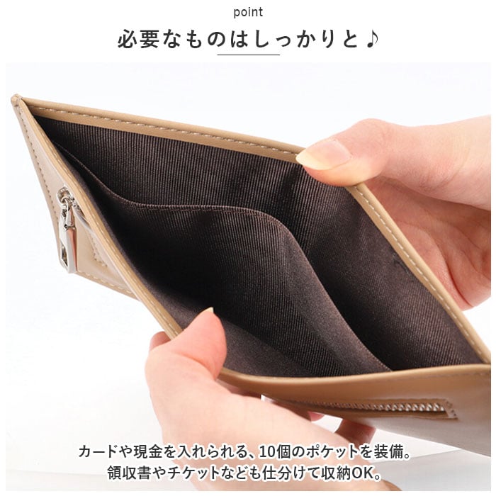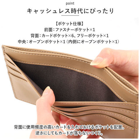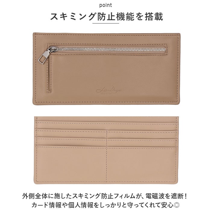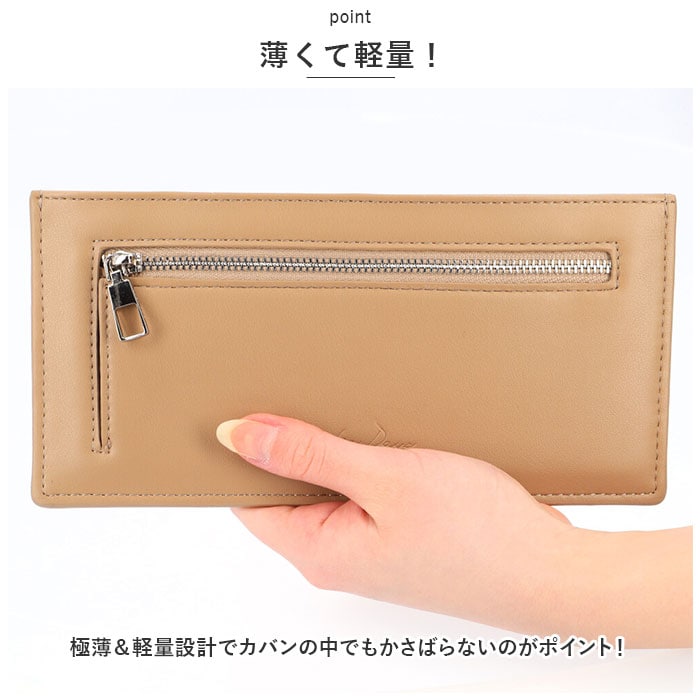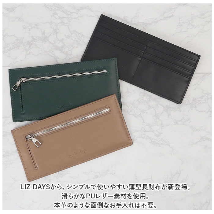 | 商品説明 | LIZ DAYSから、シンプルで使いやすい薄型長財布が新登場。【薄くて軽量!】極薄&軽量設計でカバンの中でもかさばらないのがポイント!【必要なものはしっかりと♪】カードや現金を入れられる、10個のポケットを装備。領収書やチケットなども仕分けて収納OK。【小銭をすぐに取り出せる◎】片マチ付きのファスナー式ポケットに小銭をIN。残金がひと目でわかり、お会計もスムーズ。【キャッシュレス時代にぴったり】背面に使用頻度の高いカードを入れておけるポケットを配置。逆さにしてもカードが落ちないつくり。【スキミング防止機能を搭載】外側全体に施したスキミング防止フィルムが、電磁波を遮断!カード情報や個人情報をしっかりと守ってくれて安心◎【お手入れがラクチン】滑らかなPUレザー素材を使用。本革のような面倒なお手入れは不要。【お気に入りが見つかるカラーバリエーション】ユニセックス仕様なので、ペア使いもおすすめ♪【ポケット仕様】前面:ファスナーポケット×1背面:カードポケット×6、フリーポケット×1中央:オープンポケット×1(内側にオープンポケット×1) |