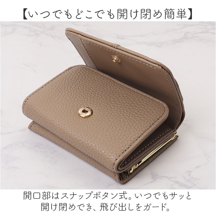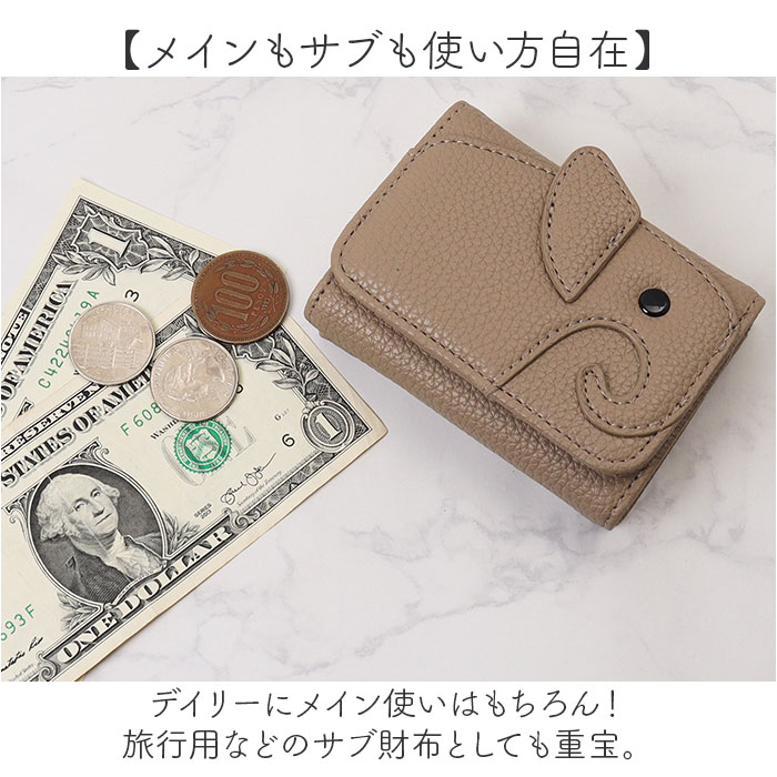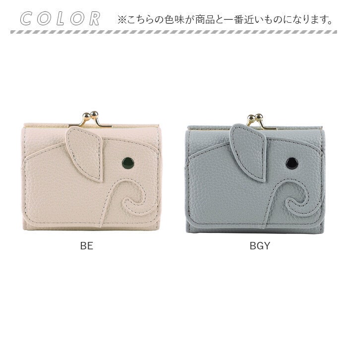 | 商品説明 | 【スマートに持ち運べて使い勝手抜群】デイリーに使いやすく、見た目も可愛い♪LIZDAYSの「ゾウモチーフミニ財布」。【幸せの象徴”ゾウさん”モチーフ】縁起の良い動物として知られる、ゾウ型のお財布。愛らしいデザインに心もほっこり。【コンパクトな三つ折り仕様】手のひらにフィットするミニ財布。必要な物がすっきりまとまり、小さめのバッグにもすっぽり。【ガバっと開く独立型小銭入れ】外側に配置された小銭入れ。スムーズに開くがま口&ボックス型で、お会計時も手間取らない♪【いつでもどこでも開け閉め簡単】開口部はスナップボタン式。いつでもサッと開け閉めでき、飛び出しをガード。【お札もカード類も最低限を収納】お札入れと3つのカードポケット。使いやすいシンプル設計で、現金派もキャッシュレス派にも。【柔らかなシボ感のある合皮素材】上品なシボが、手にしっかり馴染む◎本革のようなお手入れ不要で、気軽に使えるのが嬉しい♪【内生地にもこだわりをプラス】内生地は上質なマイクロファイバーレザー。丈夫で傷つきにくく、長く愛用!【メインもサブも使い方自在】デイリーにメイン使いはもちろん!旅行用などのサブ財布としても重宝。【人と被らずギフトにも最適】落ち着いた風合いの素材に、個性の光るゾウ型。遊び心のあるデザインで贈り物にも♪【ポケット仕様】外側:がま口式小銭入れ×1内側:お札入れ×1、カードポケット×3 |