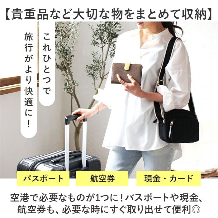 | 商品説明 | 【安全でストレスのない旅をサポート】パスポートの盗難や紛失防止に◎旅行が快適になる「LIZDAYS パスポートケース」。【スキミング防止機能を搭載】外側全体に施したスキミング防止フィルムが、電磁波を遮断!カード情報や個人情報を保護。【貴重品など大切な物をまとめて収納】空港で必要なものが1つに!パスポートや現金、航空券も、必要な時にすぐ取り出せて便利◎【いつでもどこでも開け閉め簡単】開口部はスナップボタン式。いつでもサッと開け閉めできる、ブック型タイプ。【整理整頓しやすいマルチポケット】内側には複数のポケットを配置。パスポートがぴったり収まり、中身をひと目で確認♪【現金やSIMカードも入って便利】内側にはお札やSIMカードも収まり、背面の片マチ付きポケットには小銭をIN。【手馴染みが良く、気軽に使える】上品なシボ感のあるフェイクレザー製。洗練された仕上がりながら本革のようなお手入れは不要。【スリム&軽量で持ち運びラクラク】バッグに入れてもかさばりにくいサイズ感。身軽に過ごしたい空港や旅先にぴったり。【自分用にも贈り物にもおすすめ】落ち着きがありつつ、開口部ベルトの色味を変えてアクセントに♪シンプルで長く愛用◎【ポケット仕様】内側:カードポケット×3、片開きポケット×1、フリーポケット×2、フリーポケット大×1、SIMカードポケット×2背面:ファスナーポケット×1 |