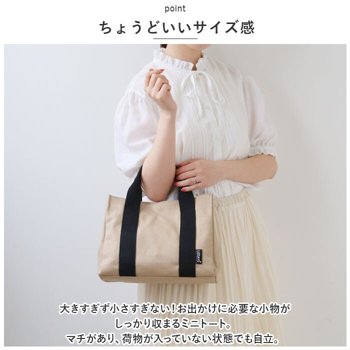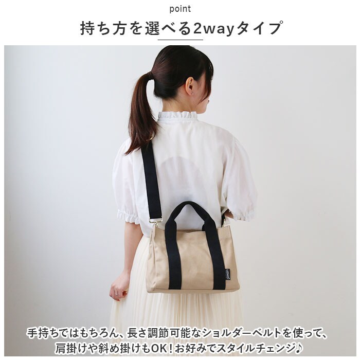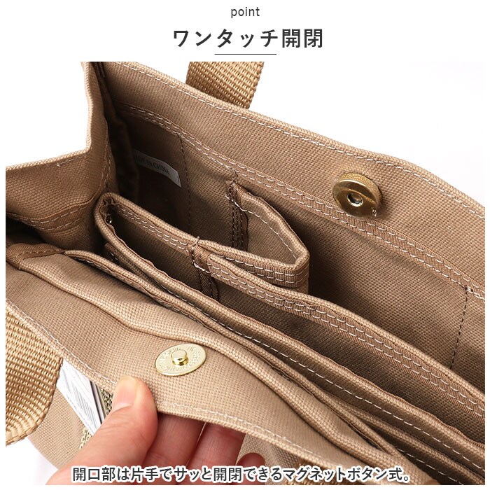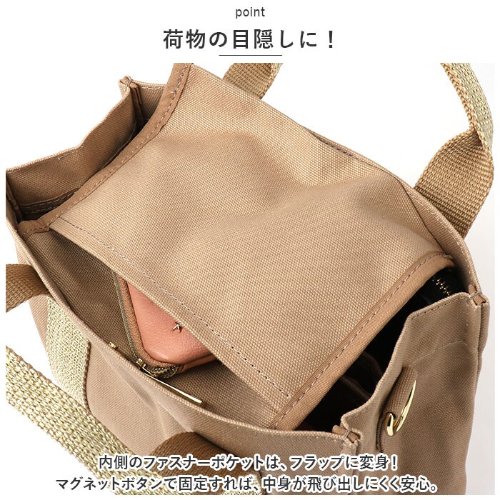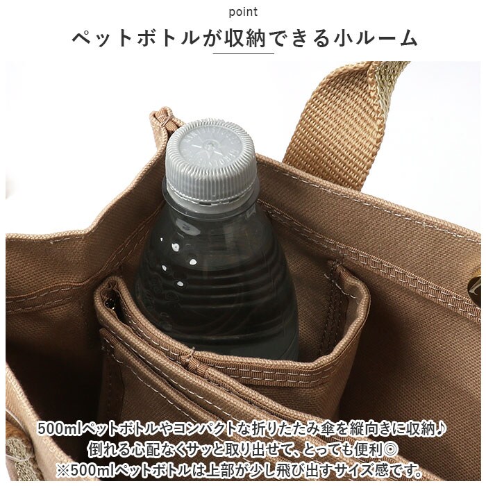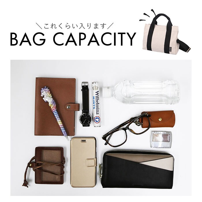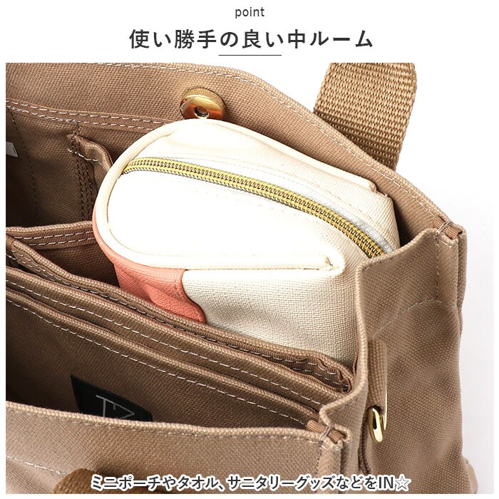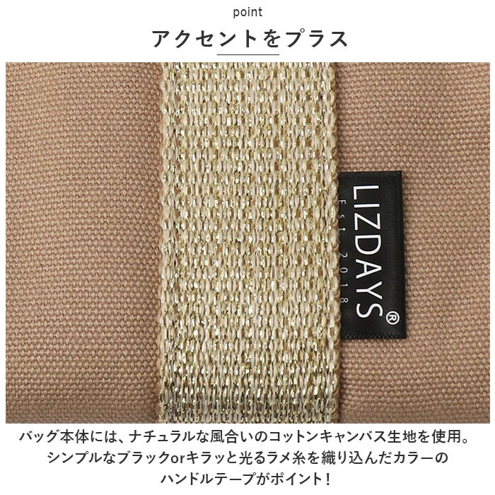| 商品説明 | すっきり収納できる♪LIZ DAYSから、機能的でデイリー使いしやすい「動かせる仕切り付きキャンバスバッグ」Sサイズが新登場。【ちょうどいいサイズ感】大きすぎず小さすぎない!お出かけに必要な小物がしっかり収まるミニトート。マチがあり、荷物が入っていない状態でも自立。【持ち方を選べる2wayタイプ】手持ちではもちろん、長さ調節可能なショルダーベルトを使って、肩掛けや斜め掛けもOK!お好みでスタイルチェンジ♪【ワンタッチ開閉】開口部は片手でサッと開閉できるマグネットボタン式。【荷物の目隠しに!】内側のファスナーポケットは、フラップに変身!マグネットボタンで固定すれば、中身が飛び出しにくく安心。【仕切り付きの3ルーム仕様】内側は3ルームに分かれており、急いでいる時も中身がひと目でわかる!誰でも収納上手に♪【A5サイズ対応の大ルーム】A5サイズのノートや長財布が、横向きにすっぽり!【使い勝手の良い中ルーム】ミニポーチやタオル、サニタリーグッズなどをIN☆【ペットボトルが収納できる小ルーム】・500mlペットボトルやコンパクトな折りたたみ傘を縦向きに収納♪倒れる心配なくサッと取り出せて、とっても便利◎(※500mlペットボトルは上部が少し飛び出すサイズ感です。)【小物が迷子になりにくい!】内側に3つのオープンポケットを装備!鍵やパスケースなどの収納に。【アクセントをプラス】バッグ本体には、ナチュラルな風合いのコットンキャンバス生地を使用。シンプルなブラックorキラッと光るラメ糸を織り込んだカラーのハンドルテープがポイント!【ポケット仕様】内側:オープンポケット×3 |