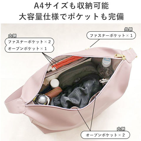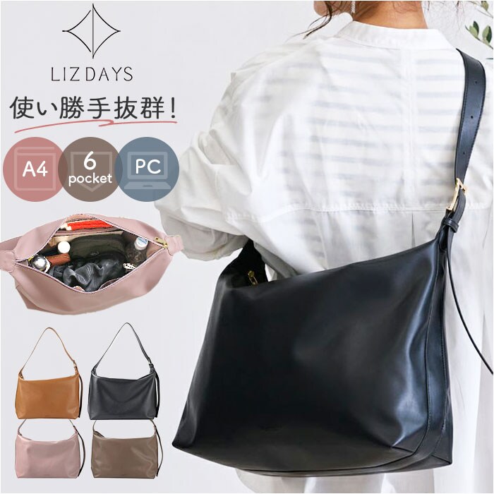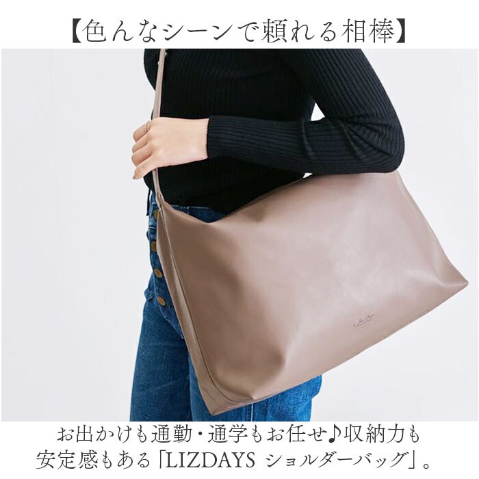 | 商品説明 | 【色んなシーンで頼れる相棒】お出かけも通勤・通学もお任せ♪収納力も安定感もある「LIZDAYS ショルダーバッグ」。【しっかり入って使い勝手抜群】お出かけに必要な荷物がひとまとめ◎移動もラクチンなショルダーバッグ!【お好みに合わせてスタイルチェンジ】サッと手に取れるワンショルダー。長さを調節し、肩掛けも斜め掛けも自在。【ボディラインに馴染むくったり感】絶妙なくったり感がポイント!肩に掛けた時に心地良くフィットして、ストレスフリー◎【開閉スムーズ、安心のファスナー式】ガバっと開いて取り出しやすく、ファスナーを閉じれば中身の飛び出しをガード。【A4対応、嬉しい万能サイズ】A4がすっぽり。マチも設けコスメポーチや500mlペットボトル、折りたたみ傘などもIN。【サクッと取り出せて迷子知らず】合計6個のポケットを配置。細々した物も、バッグの中で探す手間が不要。【手馴染みが良く、気軽に使える】柔らかく上品なツヤ感のあるフェイクレザー。洗練された仕上がりながら、お手入れは簡単。【飽きのこないシンプルなデザイン】年代問わず持ちやすく、大人コーデにマッチ。お好みのカラーをチョイス♪【ポケット仕様】内側:ファスナーポケット×2、オープンポケット×3背面:ファスナーポケット×1 |
