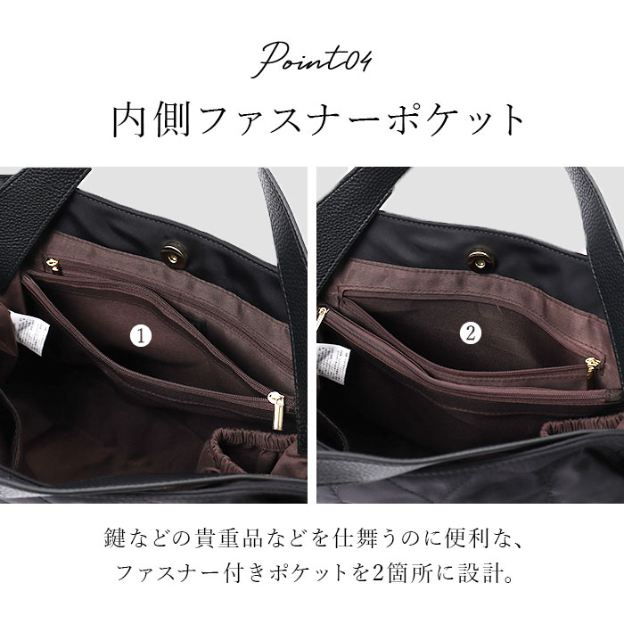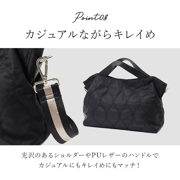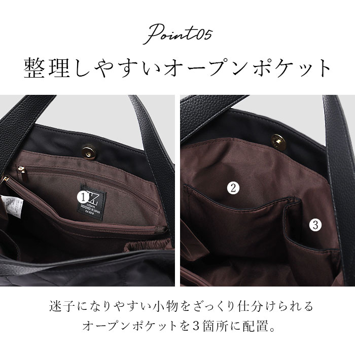 | 商品説明 | 使い勝手ばっちり。手軽に持ち出せて、おしゃれのワンポイントにもなるキルティングデザイン♪LIZDAYSから「ナイロンショルダーバッグ」が新登場。【大人な仕上がり】表面全体に施された、丸みのあるキルティングデザインが印象的☆PUレザーのハンドルや上品な光沢のあるショルダーを取り入れ、カジュアルにもキレイめにもマッチ!【持ち方を選べる2wayタイプ】手持ちのトートバッグとしてはもちろん!長さ調節可能なショルダーベルトを取り付けて、肩掛けや斜め掛けも。太めのショルダーで、肩への食い込みを防止。【ちょうどいいサイズ感】小さすぎず大きすぎない!お出かけのマストアイテムが、すっきりひとまとめ。体にかかる負担を軽減する軽量設計で、長時間の移動もストレスフリー。【ワンタッチ開閉】開口部は片手で簡単に開閉できるマグネット式。出し入れしやすく、ボタンを閉じれば中身のこぼれ落ちをガード。【B5対応サイズ】内側はB5サイズがすっぽり収まるサイズ感。程よくマチを設け、底板付きで安定感もプラス。【サッと取り出せるポケット】内側には小物を収納できる4つのポケットに、ペットボトルを倒れることなく持ち運べるボトルポケット、外側にはパスケースなどを入れておけるポケットを配置。【ちょっとの雨なら大丈夫】表面に水滴や汚れを弾く撥水加工済を施した、高密度なナイロン生地を使用。お手入れも拭き取るだけ。(※完全防水ではありません。)【お気に入りをチョイス】コーデに馴染みやすい、落ち着きのあるカラーをラインナップ。年代問わず持ちやすいデザインも魅力。【ポケット仕様】内側:ファスナーポケット×2、オープンポケット×3、ボトルポケット×1背面:ファスナーポケット×1 |