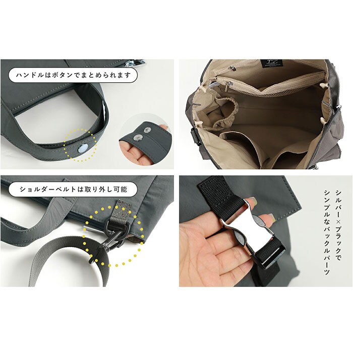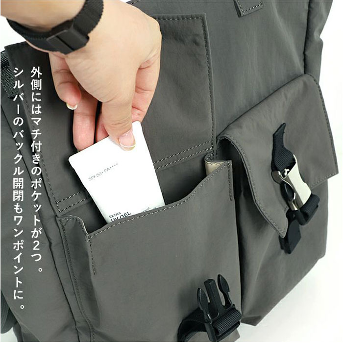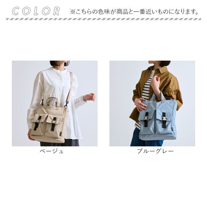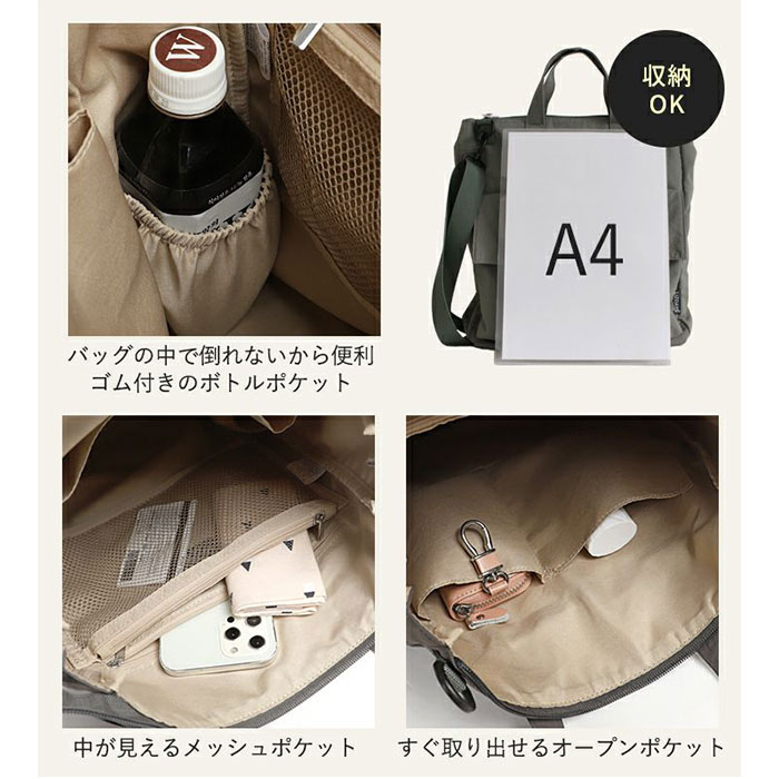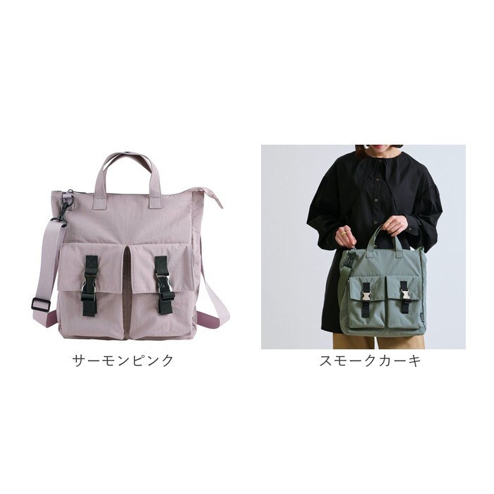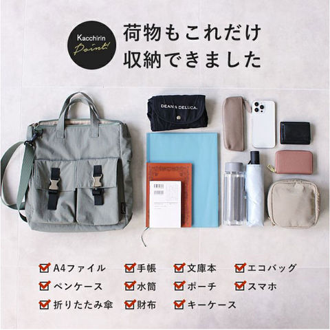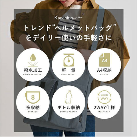 | 商品説明 | 【色んなシーンで頼れる相棒】大活躍のKacchirin Helmet bag STYLE 2WAY TOTE BAG【アクティブなKacchirin】カジュアル感のあるデザインに、LIZDAYSらしく機能性をプラスしたシリーズ☆【ヘルメットバッグを手軽に♪】トレンドのヘルメットバッグを、デイリー使いしやすくアレンジ。気軽に使えて収納力も!(※1)ヘルメットバッグとは、米軍兵がヘルメットや酸素マスクを持ち運ぶために作られたバッグのこと。ミリタリー由来のデザイン。【お好みに合わせてスタイルチェンジ】手持ちで。長さ調節可能なショルダーを取り付け、肩掛けや斜め掛けも自在な2WAY!(※2)持ち手はスナップボタンベルトでまとめることが可能です。【開閉スムーズ、安心の天ファスナー】ガバっと開いて取り出しやすく、ファスナーを閉じれば中身の飛び出しをガード。【A4対応でざっくりひとまとめ】A4がすっぽり。程よいマチで、ポーチやドリンクボトルなどお出かけに必要な荷物が1つに。【充実のポケット仕様で迷子知らず】合計8個のポケットを配置。小物を整頓しやすく、バッグの中で探す手間が不要。【軽やかな使い心地でストレスフリー】体に負担がかかりにくい軽量設計。荷物を沢山入れても、重くなりすぎずアクティブに動ける!【ちょっとの雨なら大丈夫】汚れや水滴を弾きやすい、撥水加工を施したナイロン生地。お手入れも拭き取るだけ。(※3)完全防水ではありません。【持っていればヘビロテ間違いなし】ミリタリーらしさを残しつつ、おしゃれなくすみカラーで仕上げたトート。内生地の視認性も◎(※4)内生地は明るいカラーで仕上げております。【ポケット仕様】内側:ファスナーポケット×1、ファスナー式メッシュポケット×1、オープンポケット×3、ボトルポケット×1前面:バックル付きフラップポケット×2 |