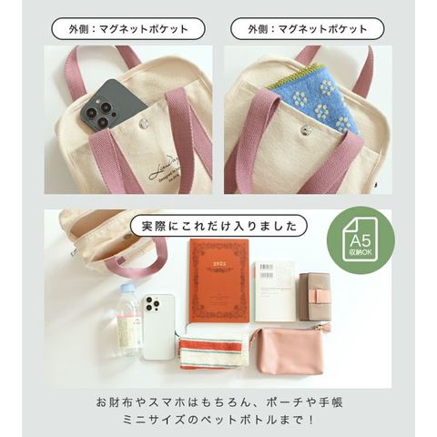 | 商品説明 | 【毎日使える2WAYバッグ】軽やかに持てて、斜めがけもOKな万能ミニトート。【手持ちも肩掛けも自由】取り外しショルダー付きで気分に合わせて使い分けられる2WAY仕様♪【自立する安定感】底が硬めのつくりでしっかり自立するから、カフェや電車内でも置きやすい◎【軽やかな使い心地】軽量ボディで長時間の外出も肩に負担をかけない快適さ〇【シンプルなデザインが魅力】キャンバス素材のナチュラルな風合いがカジュアルコーデに溶け込む。【マグネットで開閉】マグネットで開閉できるポケットが前後に配置。スマホや定期入れなど小物がサッと取り出せる! |