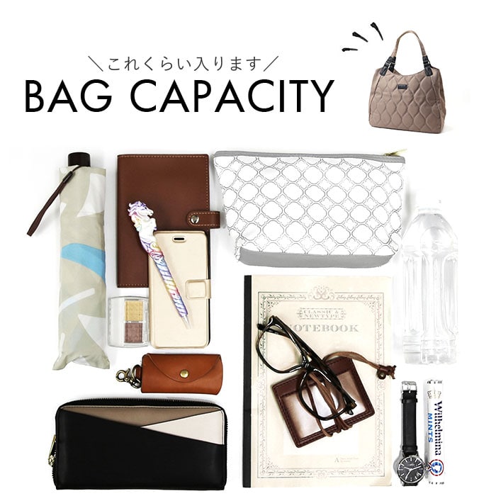 | 商品説明 | 【シーンを問わないお出かけの味方】おしゃれに持ち歩けてヘビロテ♪「LIZDAYS キルティングナイロントートバッグ」。【上品な印象のキルティングデザイン】落ち着きのあるカラーに、ふっくらキルティング♪どんなコーデにも素敵にマッチ。【肩掛けできて移動がラクラク】ハンドルは、アウターの上からでも肩に掛けられる長さに設計。荷物が重くなっても大丈夫。【整理整頓しやすい3スペース仕様】メインルームの他、前後にあおりポケットを装備した3層構造。荷物を定位置に収めやすい◎【ガバっと開くダブルファスナー】メインは左右どちらからもオープン。中身を確認しやすく、閉じればプライバシーを確保。【B5対応ですっきりひとまとめ】B5が横向きに、折りたたみ傘やコスメポーチなどもざっくり。底板内蔵で安定感も。【サクッと取り出せて迷子知らず】内側には3つのポケットを配置。細々した物も、バッグの中で探す手間が不要。【マグネットボタンでワンタッチ開閉】力いらずで開閉できるあおりポケット。A4対応&スリムな小物を収納できて便利。(※1)荷物量に応じて、A4を収納すると角が折れる可能性なども出てくるため、ご注意ください。【背面には使用頻度の高い物を】背面にもポケット付き。パスケースやスマホなど、すぐに取り出したい物を収納できて便利。【軽やかな使い心地でノンストレス】体に負担をかけない軽量設計。疲れを軽減でき、通勤・通学用やマザーズバッグとして重宝。【丈夫でキレイなフォルムをキープ】耐久性のある高密度ナイロンを使用。崩れしにくく、ガシガシ使えるのが嬉しい!【ちょっとの雨なら大丈夫】表面は汚れや水滴を弾きやすい、撥水加工済み。お手入れも拭き取るだけ。(※2)完全防水ではありません。【飽きが来ず長く愛用できるデザイン】トレンドに左右されない仕上がり。シボのあるPU素材など、異素材使いもアクセント! |