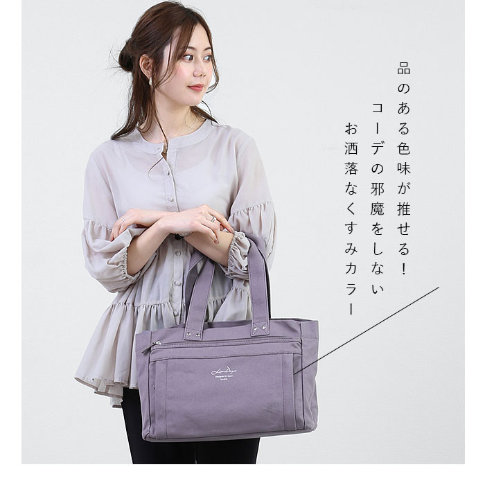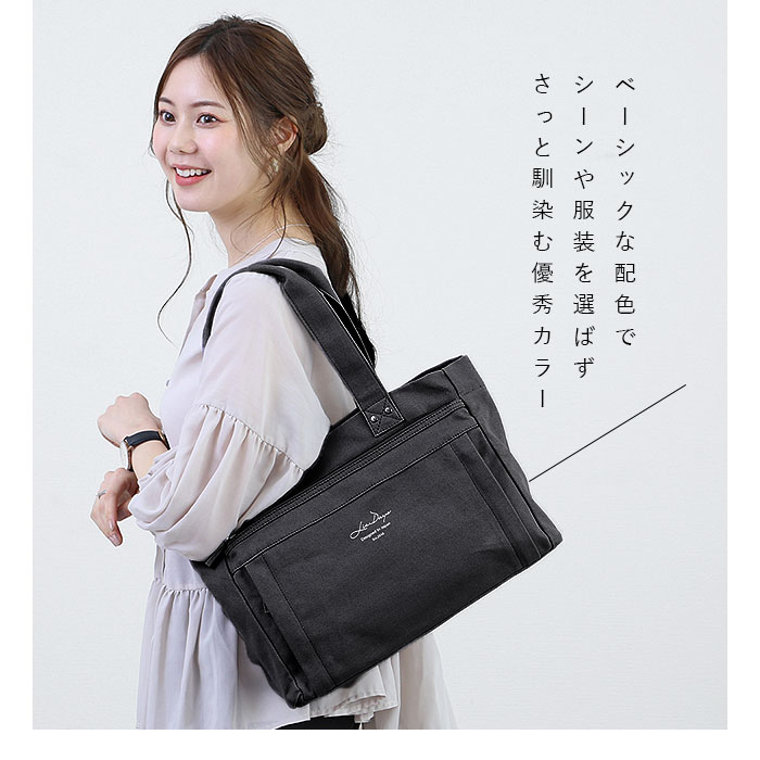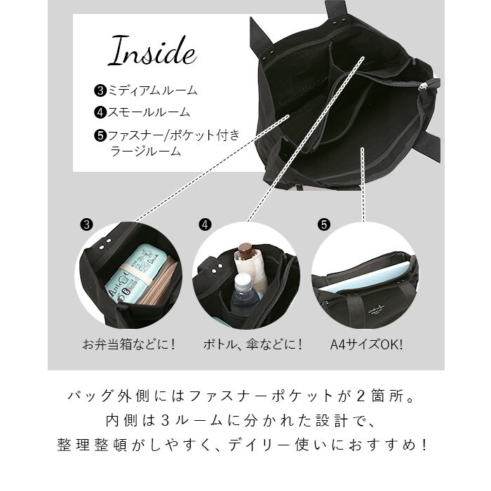 | 商品説明 | 大人女子に人気のLIZ DAYSから、誰でも収納上手になれちゃう「仕切り付き Wアクセスロングハンドルトート」が新登場。収納部分が3つの仕切りで区切られているので、何がどこにあるのか一目でわかりやすい!メイン収納部はファスナー式で中身がこぼれ落ちる心配がなく、プライバシーをしっかり確保◎内側はA4サイズが横向きにすっぽり収まるサイズ感で、小物収納に便利なオープンポケット×1付き。オープン収納部左側はランチボックスやメイクポーチ、右側は500mlペットボトルや折りたたみ傘などを立てて収納するのに最適。フロント外側には縦型のファスナーポケットと、両サイドから開けられるファスナーポケットを配置。パスケースなどすぐに取り出したい小物の収納に便利!しっかりとした厚手のキャンバス生地を採用。バッグが型崩れせずきちんと自立して、使い勝手抜群!太めに設計された持ち手ハンドルで手持ちはもちろん、肩掛けもOK。通勤・通学、普段のお出かけなど幅広く活躍。 |
