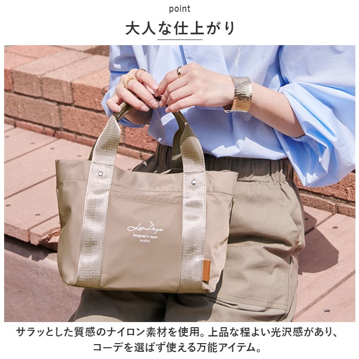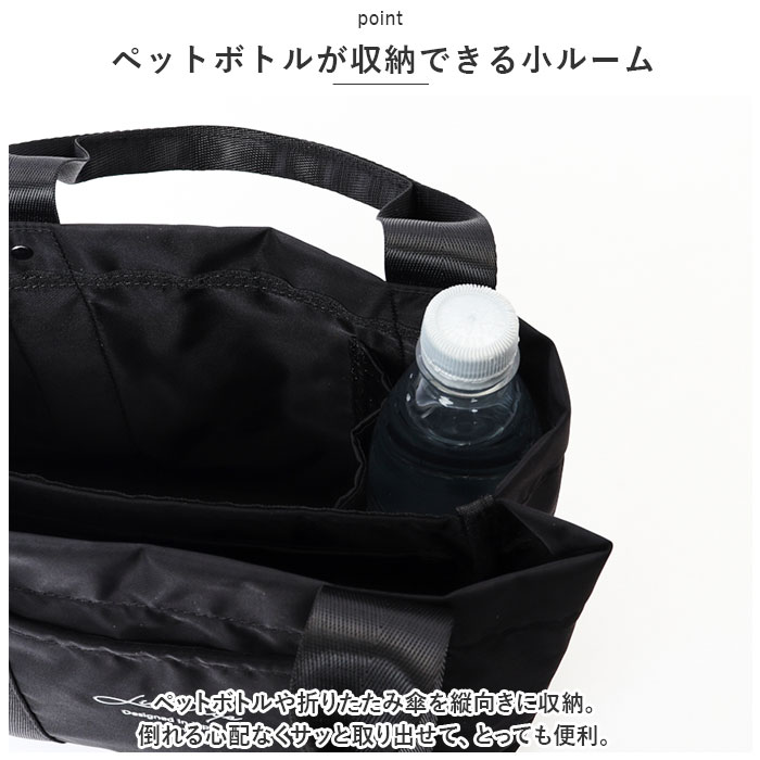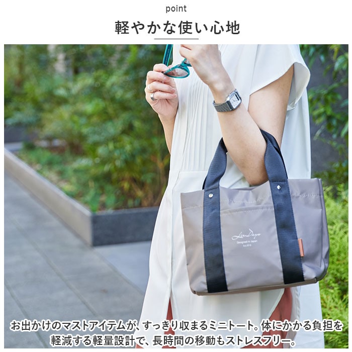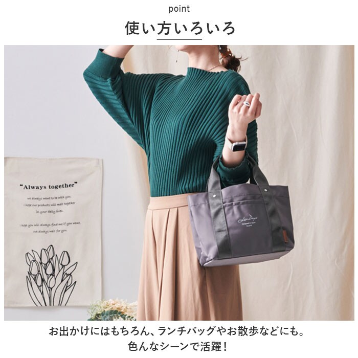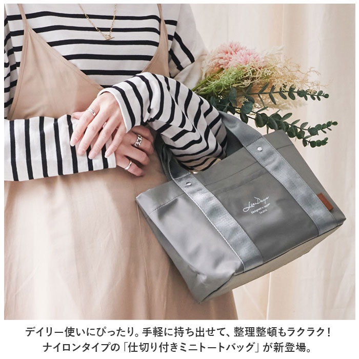 | 商品説明 | デイリー使いにぴったり。手軽に持ち出せて、整理整頓もラクラク!ナイロンタイプの「仕切り付きミニトートバッグ」が新登場。【大人な仕上がり】サラッとした質感のナイロン素材を使用。上品な程よい光沢感があり、コーデを選ばず使える万能アイテム。【軽やかな使い心地】お出かけのマストアイテムが、すっきり収まるミニトート。体にかかる負担を軽減する軽量設計で、長時間の移動もストレスフリー。【オープン開口】開口部はガバっと開くオープンタイプ。中身が見やすく、取り出しもスムーズ。【仕切り付きの3ルーム仕様】内側は3ルームに分かれており、急いでいる時も中身がひと目で確認できて誰でも収納上手に♪仕切りは荷物の大きさに合わせて調節できる可動式。【B5サイズ対応の大ルーム】B5サイズのノートが横向きにすっぽり。長財布や本も収納OK。【使い勝手の良い中ルーム】ミニポーチやサニタリーグッズ、コンパクトなお弁当箱などが収まるサイズ感。【ペットボトルが収納できる小ルーム】ペットボトルや折りたたみ傘を縦向きに収納。倒れる心配なくサッと取り出せて、とっても便利。【小物が迷子になりにくい!】内側と外側に1つずつポケットを装備!移動中も、小物が取り出しやすいつくり。【使い方いろいろ】お出かけにはもちろん、ランチバッグやお散歩などにも。色んなシーンで活躍!【ちょっとの雨なら大丈夫】両面に水滴や汚れを弾く撥水加工済みで、お手入れも拭き取るだけ。(※完全防水ではありません。)【お気に入りをチョイス】コーデに馴染みやすい、落ち着きのあるカラーをラインナップ。年代問わず持ちやすいデザインも魅力。【ポケット仕様】内側:オープンポケット×1前面:オープンポケット×1 |