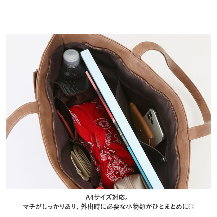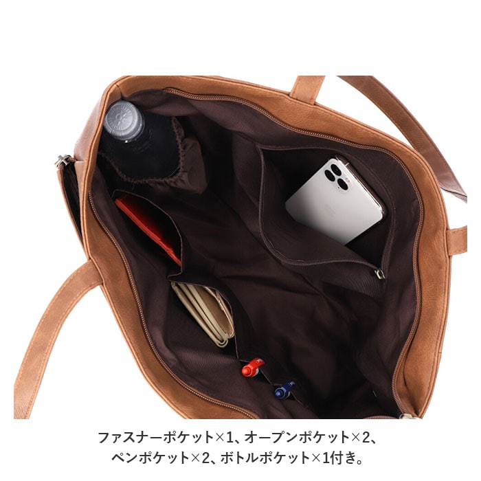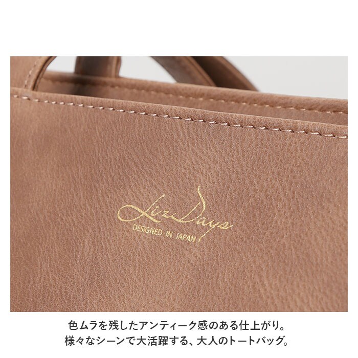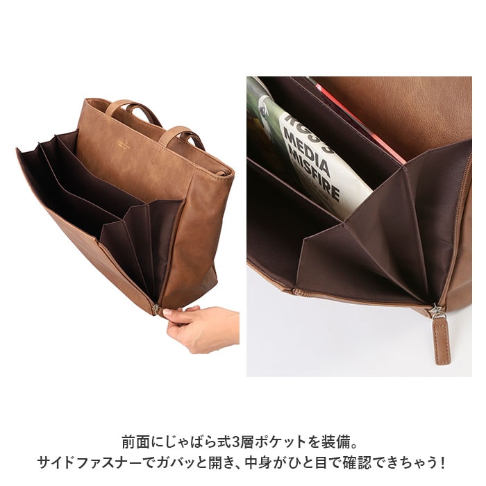 | 商品説明 | LIZ DAYSからビジネスシーンにも最適な「アコーディオンポケットトートバッグ」が新登場。前面にじゃばら式3層ポケットを装備。サイドファスナーでガバッと開き、中身がひと目で確認できちゃう!A4サイズ以下の書類やクリアファイル、雑誌をすっきり整理整頓♪オープンタイプのポケットなので、サッと取り出しOK。(※収納物により、上部が少しはみ出る可能性があります。)開口部は天ファスナー式。中身がこぼれ落ちることなく、プライバシーも確保。内側はA4サイズ対応。マチがしっかりあり、外出時に必要な小物類がひとまとめに◎ブラウンカラーの内生地で汚れが目立ちにくい!暗すぎない色合いで、小物を見つけやすいのもポイント。ファスナーポケット×1、オープンポケット×2、ペンポケット×2、ボトルポケット×1付き。底板が内蔵されているので、荷物を安定した状態で持ち運び可能。背面にスマホやパスケースなどを入れておける、ファスナーポケットを配置。本革よりも軽い合皮素材を使用しており、肩にかかる負担を軽減◎ハンドルは長めの設計。オーバーサイズのトップスや、厚手のアウターの上からでもラクラク肩掛け♪色ムラを残したアンティーク感のある仕上がり。様々なシーンで大活躍する、大人のトートバッグ。 |