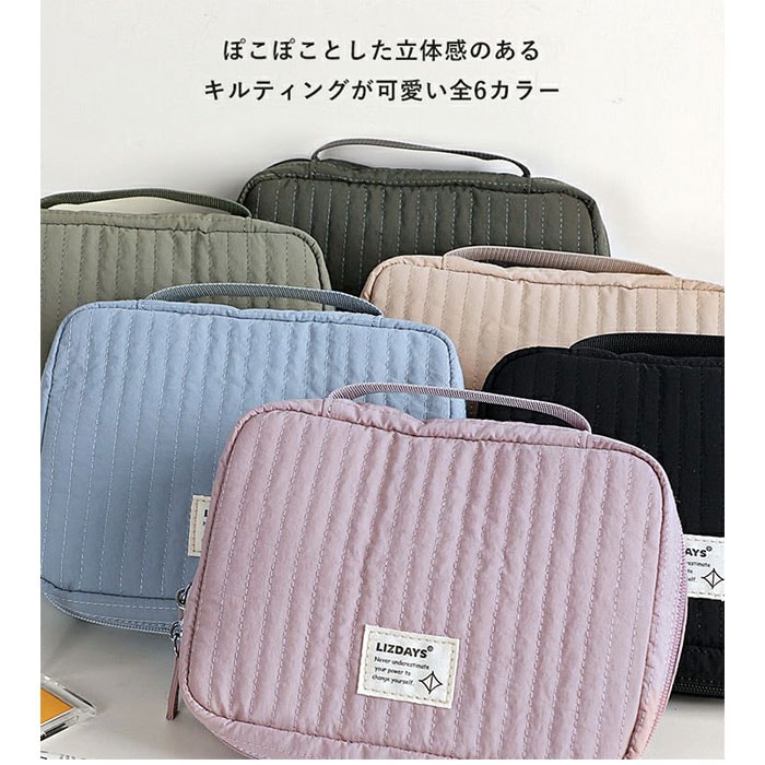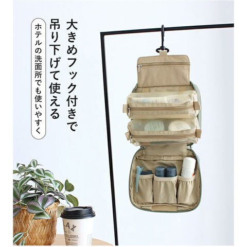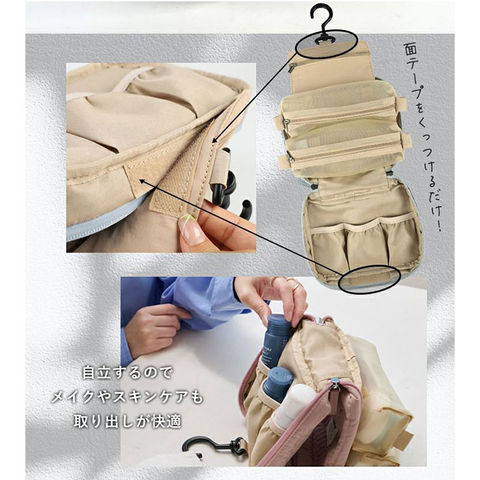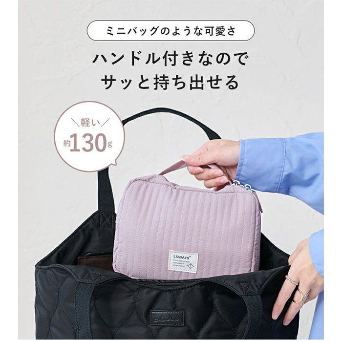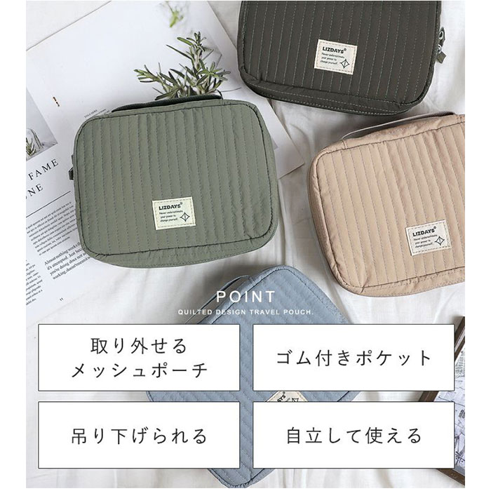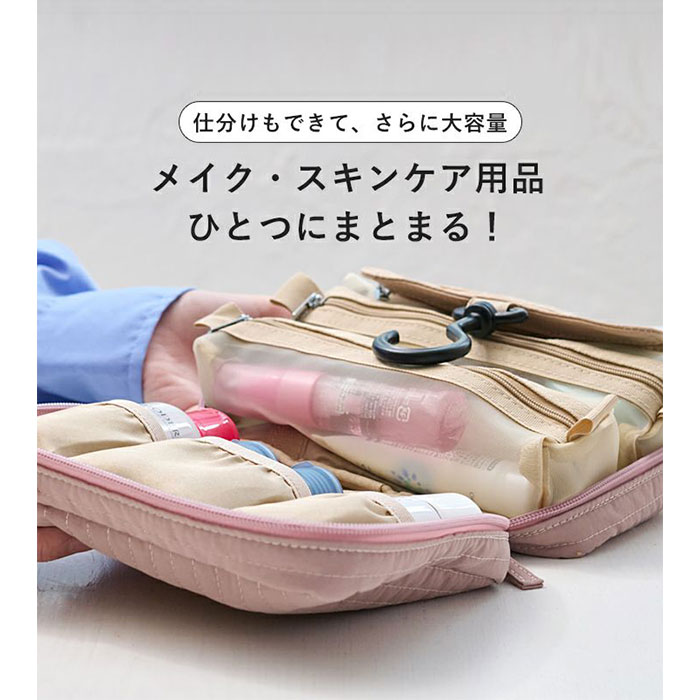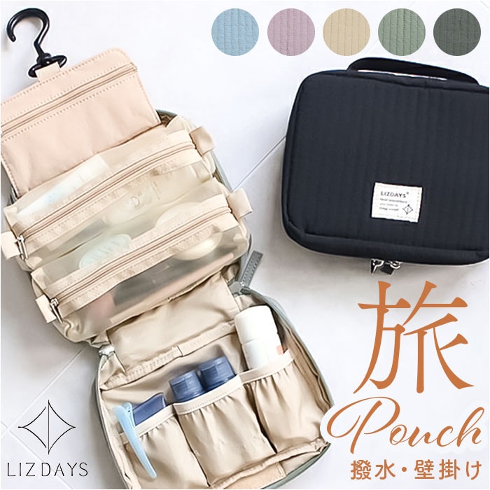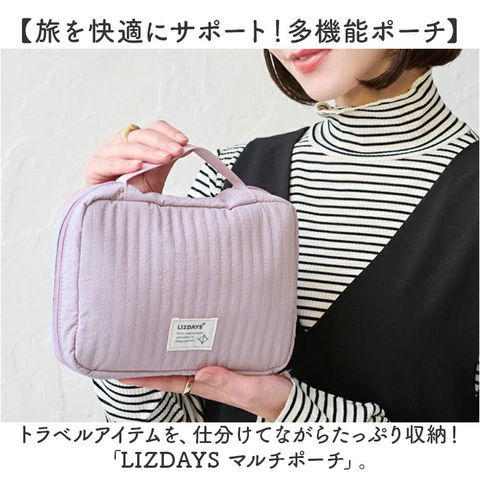 | 商品説明 | 【旅を快適にサポート!多機能ポーチ】トラベルアイテムを、仕分けてながらたっぷり収納!「LIZDAYS マルチポーチ」。【ポコポコ可愛いキルティング】ふんわり感のあるキルティングデザイン。シンプルで大人女子にぴったりの仕上がり。【水回りでも慌てない撥水性をプラス】サラリとしたナイロン素材に、水滴や汚れを弾く撥水加工済み。ちょこっと水がはねても大丈夫。(※)防水仕様ではありません。【スペースの限られた洗面でも快適】・360度回転式S字フックを使ってホテルの洗面台などに吊り下げれば、便利な壁掛け収納に。【自立させてテーブルでも使いやすく】反転させて、面ファスナー同士をくっつけると自立。取り出しやすく、場所を選ばない♪【ガバっと開いて出し入れスムーズ】左右どちらからも開くダブルファスナーで、180度オープン。使いたいアイテムが一目瞭然◎【コスメもスキンケア用品も一緒に】多くのポケットを装備。コスメはもちろんスキンケアのボトル類、歯ブラシなどもひとまとめ。【取り外し可能なメッシュポケット】通気性に優れた2つのメッシュポーチは、面ファスナー着脱。仕分けしやすく単体使いも。【程よくフィットするゴム口ポケット】ボトルやミニスプレーなどをIN。大きさに合わせて伸縮し、こぼれ落ちにくくすっきり収納。【迷子にならないファスナーポケット】替えのコンタクトや絆創膏、常備薬など!細々した小物を入れておけて便利。【手持ちできる軽やかなバッグ型】軽量で外側上部に持ち手付き。手に取りやすく、旅先の大浴場や温泉などへの移動もラクラク。【お気に入りを選べるカラー】ベーシックや柔らかなカラーに、ロゴタグをON。使う人を選ばない仕上がりで贈り物にも。【ポケット仕様】内側:メッシュポケット×2(取り外し可能)、ゴム口ポケット×3、ファスナーポケット×1 |