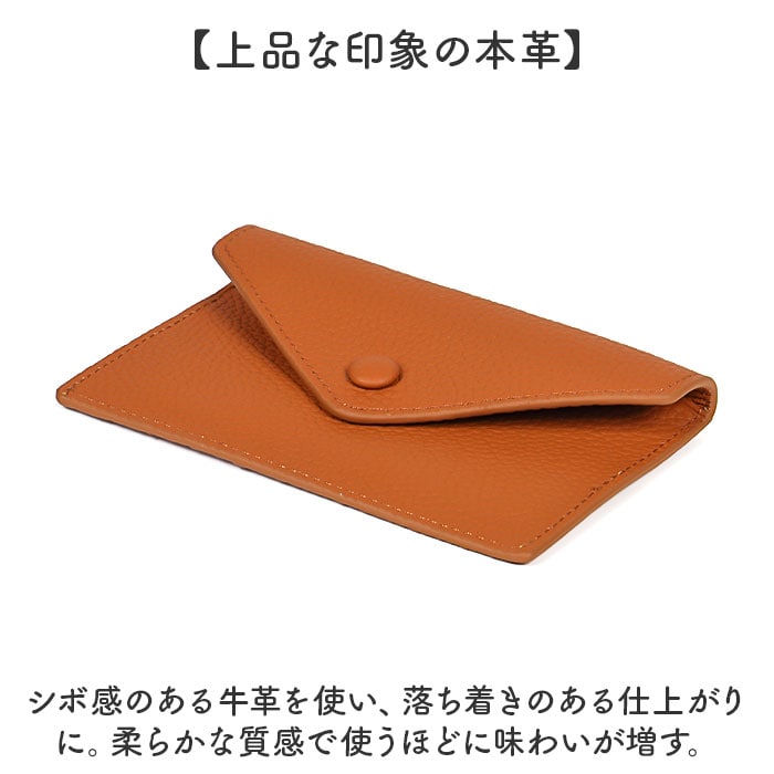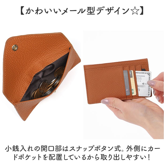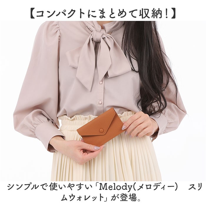 商品説明【コンパクトにまとめて収納!】シンプルで使いやすい「Melody(メロディー) スリムウォレット」が登場。【上品な印象の本革】シボ感のある牛革を使い、落ち着きのある仕上がりに。柔らかな質感で使うほどに味わいが増す。【かわいいメール型デザイン☆】小銭入れの開口部はスナップボタン式。外側にカードポケットを配置しているから取り出しやすい!【使い勝手の良いサイズ感と収納力】バッグに入れてもかさばらないスリムな形状。キャッシュレス派の方にもおすすめ。【ユニセックス仕様】無駄のないシンプルなデザインと落ち着きのあるカラー。幅広い年代で使えるので、ギフトにもおすすめ。【ポケット仕様】カードポケット×4、フリーポケット×2