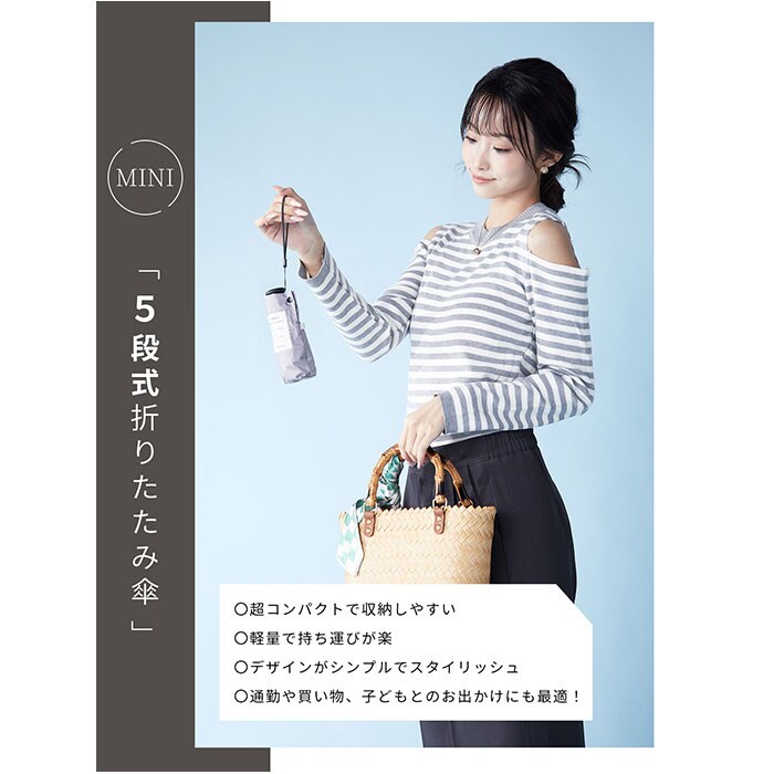 | 商品説明 | 【全天候対応!いつでも心強い味方】これ1本で安心の晴雨兼用タイプ。持ち運びもスマートなnano 5段式日傘 折りたたみ傘。【超コンパクトな5段式収納】・5段式の折りたたみ傘。バッグに忍ばせやすく、持ち歩きのストレスを液減。【一級遮光で晴れた日の味方】UVカット率100%!外生地は太陽光・太陽熱・紫外線を反射、日焼けをガードし美肌を守る♪【日陰のような涼しさで熱中症対策】内側ブラックコーティングで遮光率100%。光を反射させて温度の上昇を防ぎ照り返しガード。(※1)約-17度の遮熱効果があります。暑さを引き起こす可視光全と赤外線をカット。【優れた撥水力で雨の日も安心】撥水最高等級5級の傘生地。雨粒もサッと弾いて、お天気の急変にも対応。【いつでもどこでもイージーオープン】傘骨をポキポキ折る手間なく、スムーズに開閉できる手開き仕様。ワンアクションで対応!【安心・安全のセーフカバー付き】爪や指を挟むのを防止する安全ロクロ。開閉時のケガを防ぎ、ネイルを施した爪も保護。【しなやかで丈夫なグラスファイバー】親骨の一部は、弾力性があり折れにくいグラスファイバー。強度が高く、使い勝手抜群。【サッとまとまる面ファスナーバンド】傘生地をまとめるバンドは、面ファスナー式。幅広でたたむ時も手間取らず、ひとまとめ。【持ち歩きやすい収納袋付き】傘生地と同じカラーの収納袋付き。口部分はスナップボタン式。【シーンを選ばないシンプルデザイン】ベーシックカラーを使った、落ち着きのある仕上がり。オン・オフ問わず活躍。 |
