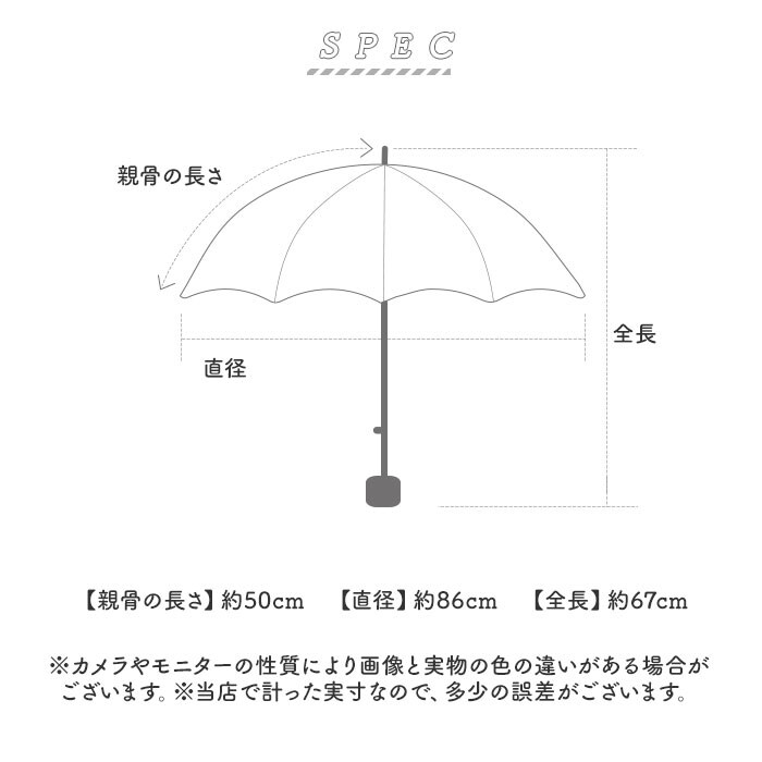 | サイズ | [親骨の長さ]約50cm/[直径]約86cm/[全長]約67cm [収納時の長さ]約44cm [収納時の幅]約8cm ※サイズは当店計測の実寸サイズです。実際の商品ならびにメーカー表記サイズとは多少の誤差が生じる場合がございます。あらかじめご了承ください。 |