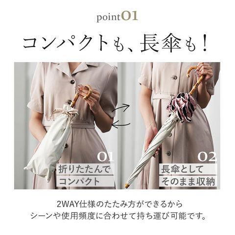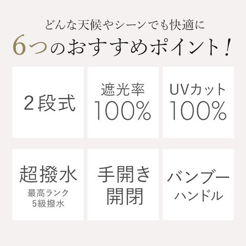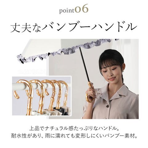 | 商品説明 | 【どんな天候やシーンでも快適に】コンパクトさと美しさを兼ね備えた「nino 2段式折りたたみ日傘」が新登場。【可憐で優雅なスタイルを演出】フリルが目を惹く、華やかなデザイン。上品な印象で、キレイめスタイルにマッチ。【お好みに合わせてスタイルチェンジ】折ればコンパクト、折らずに長傘として。気分に合わせて使える2WAY仕様。【一級の完全遮光で晴れた日の味方】遮光率&UVカット率100%、UPF50+!紫外線をしっかりカット。【まるで日陰のような涼しさを体感】光を反射させて温度の上昇を防ぐ遮熱効果も高く、暑い日の熱中症予防に。(※1)内側ブラックカラーで、照り返しによる肌や目への反射もカットします。【雨粒をサッと弾く超撥水加工】撥水度は最高ランクの5級。雨傘としても使えて、お天気が不安定な日も安心。(※2)激しい雨の際は、雨水が染みることがあるのでご注意ください。【ネイルガード付きの手開きタイプ】傘生地がスムーズに開閉できる手開き傘。手指を挟みにくいよう配慮された安心設計。【サクッと留められるボタン式バンド】傘生地を留めるバンドは、バチンっと留めやすいスナップボタンタイプ。嬉しい2段階式。【丈夫で風合いのあるハンドル】ナチュラル感たっぷりなハンドル。耐水性があり、雨に濡れても変形しにくいバンブー素材。【持ち歩きに便利な収納袋が付属】キュッと絞ってリボン結びできる、巾着タイプの収納袋。おしゃれに持ち歩けるのが嬉しい!【お気に入りを選べるカラー】年代問わず使いやすいカラーリング。雨の日も楽しくお出かけ☆ |