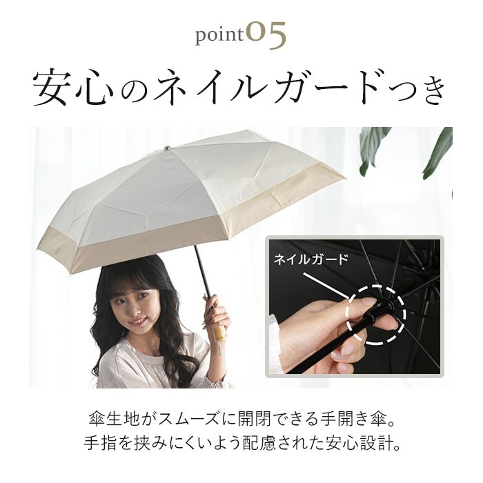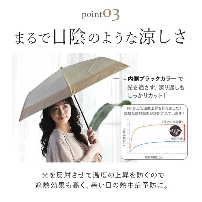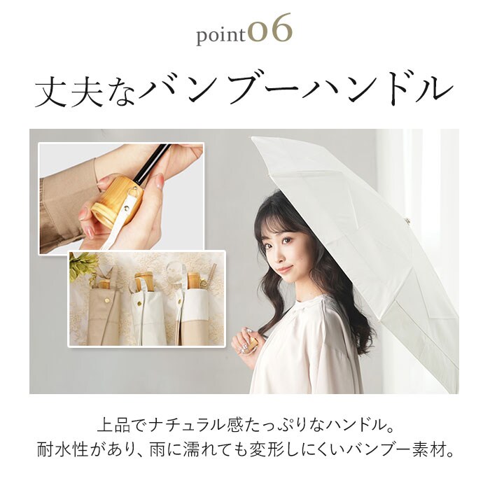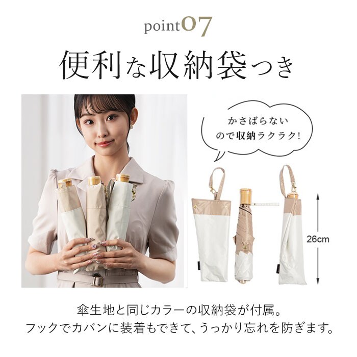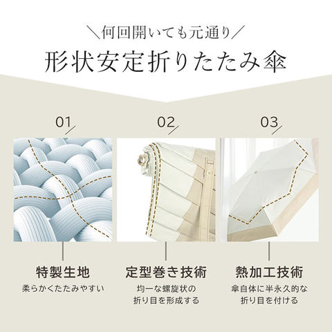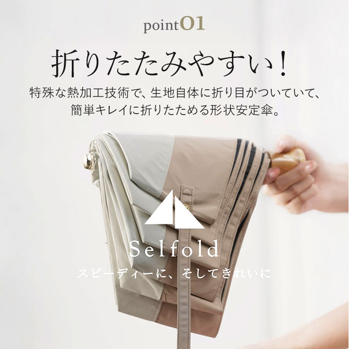 | 商品説明 | 【サッと折りたためてノンストレス】収納がスピーディー!形状安定タイプの「stella 折りたたみ日傘」が新登場。【たたむ動作の煩わしさから解放】特殊な熱加工技術で、生地自体に折り目を。簡単キレイに折りたためる形状安定傘。(※1)半永久的に効果が持続します。【一級の完全遮光で晴れた日の味方】遮光率&UVカット率100%、UPF50+!紫外線をしっかりカット。【まるで日陰のような涼しさを体感】光を反射させて温度の上昇を防ぐ遮熱効果も高く、暑い日の熱中症予防に。(※1)内側ブラックカラーで、照り返しによる肌や目への反射もカットします。【雨粒をサッと弾く超撥水加工】撥水度は最高ランクの5級。雨傘としても使えて、お天気が不安定な日も安心。(※2)激しい雨の際は、雨水が染みることがあるのでご注意ください。【いつでもどこでもイージーオープン】傘骨をポキポキ折る手間なく、スムーズに開閉できる手開き仕様。【安心・安全のセーフガード付き】爪や指を挟むのを防止するカバーを装備。開閉時のケガを防ぎ、ネイルを施した爪も保護。【軽量&コンパクトで持ち歩きに便利】毎日携帯することを考え、軽量化を実現。バッグの隙間にスッと収まるサイズ感。【丈夫で風合いのあるハンドル】ナチュラル感たっぷりなハンドル。耐水性があり、雨に濡れても変形しにくいバンブー素材。【サッとINできる収納袋付き】傘生地と同じカラーの収納袋が付属。フックでカバンに装着も可能。【お気に入りを選べるカラー】年代問わず使いやすい、柔らかなバイカラー。雨の日も楽しくお出かけ☆ |