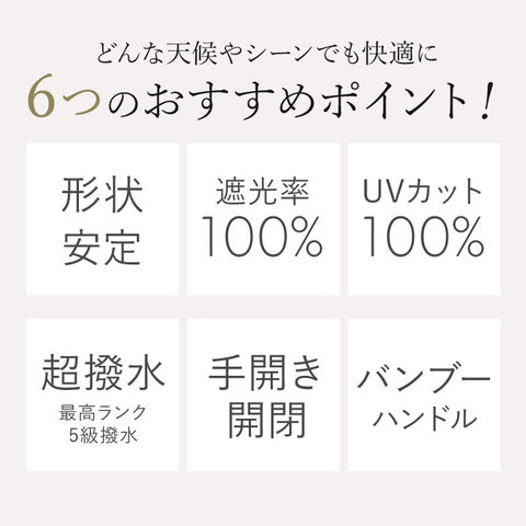 | サイズ | [親骨の長さ]約50cm/[直径]約88cm/[全長]約54.5cm [収納時の長さ]約25.5cm [収納時の幅]約4.6cm ※サイズは当店計測の実寸サイズです。実際の商品ならびにメーカー表記サイズとは多少の誤差が生じる場合がございます。あらかじめご了承ください。 |