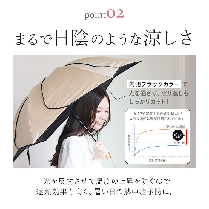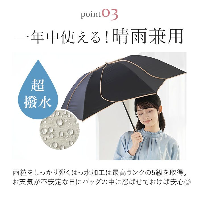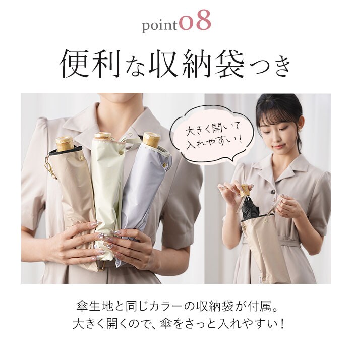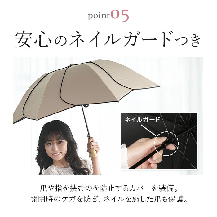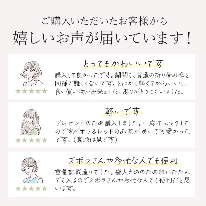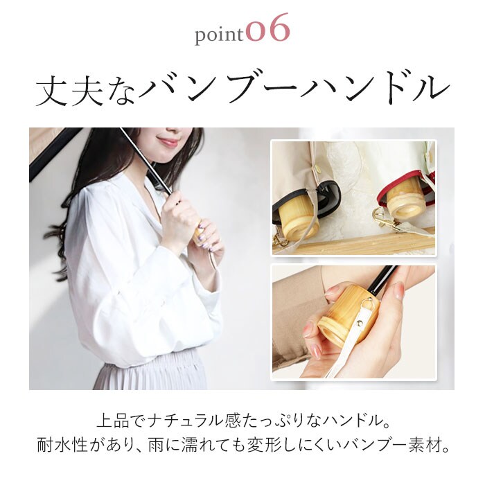 | 商品説明 | 【おしゃれに持ち歩けて機能性も抜群】暑い日のお出かけに、心強い相棒を♪「SAKASA ameri 花びら折りたたみ日傘」。【可愛らしいフラワーシルエット】花びらに包まれるようなデザイン。上品な印象で、華やかな気分に♪【一級遮光で晴れた日の味方】遮光率、UVカット率100%!気になる紫外線をしっかりカット。【まるで日陰のような涼しさを体感】光を反射させて温度の上昇を防ぐ遮熱効果も高く、暑い日の熱中症予防に。(※1)内側ブラックカラーで、照り返しによる肌や目への反射もカットします。【雨粒をサッと弾く超撥水加工】撥水度は最高ランクの5級。雨傘としても使えて、お天気が不安定な日も安心。(※2)激しい雨の際は、雨水が染みることがあるのでご注意ください。【開閉はワンアクションでスムーズ】ポキポキ折らずイージーオープン!濡れた面が内側にくる逆折り式で、雫が飛び散る心配なし。【安心・安全のネイルガード付き】爪や指を挟むのを防止するカバーを装備。開閉時のケガを防ぎ、ネイルを施した爪も保護。【サクッと留められるボタン式バンド】傘生地を留めるバンドは、バチンっと留めやすいスナップボタンタイプ。嬉しい2段階式。【丈夫で風合いのあるハンドル】ナチュラル感たっぷりなハンドル。耐水性があり、雨に濡れても変形しにくいバンブー素材。【ストレスなく持ち歩ける軽量設計】毎日携帯できるよう、軽量化を実現。カバンの隙間にも収まりやすいスリムフォルム。【持ち歩きに便利な収納袋付き】傘生地と同じカラーの収納袋が付属。カバンに忍ばせて、スマートに持ち運び。【バッグのハンドルに取り付けOK】収納袋は片側がナスカンで着脱可能。バッグに装着することもできて便利。【お気に入りを選べるカラー】年代問わず使いやすい、柔らかなカラー。オン・オフ問わず大活躍。 |