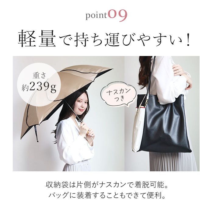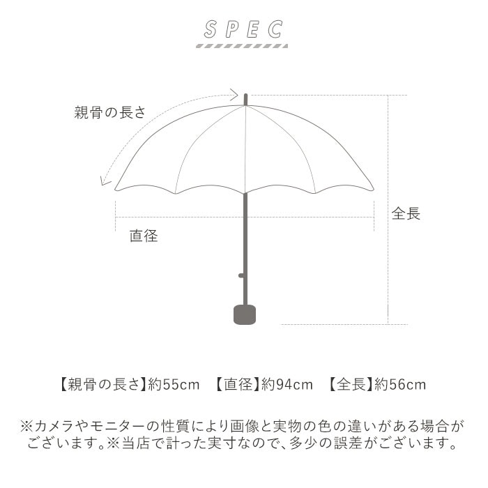 | サイズ | [親骨の長さ]約55cm/[直径]約94cm/[全長]約56cm [収納時の長さ]約26cm [収納時の幅]約6cm 【収納袋】 [縦]約26cm/[上部横幅]約14cm/[底部横幅]約10cm ※サイズは当店計測の実寸サイズです。実際の商品ならびにメーカー表記サイズとは多少の誤差が生じる場合がございます。あらかじめご了承ください。 |