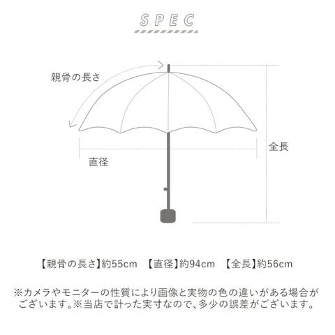 | サイズ | [親骨の長さ]約55cm/[直径]約94cm/[全長]約56cm [収納時の長さ]約26cm [収納時の幅]約6cm 【収納袋】 [縦]約26cm/[上部横幅]約14cm/[底部横幅]約10cm ※サイズは当店計測の実寸サイズです。実際の商品ならびにメーカー表記サイズとは多少の誤差が生じる場合がございます。あらかじめご了承ください。 |