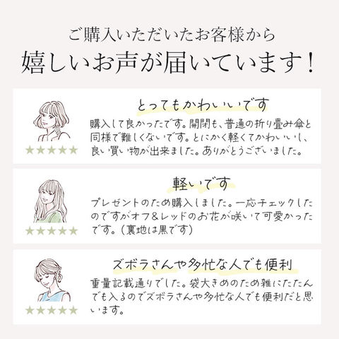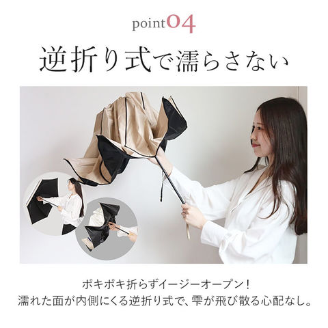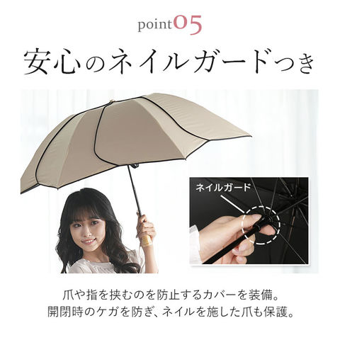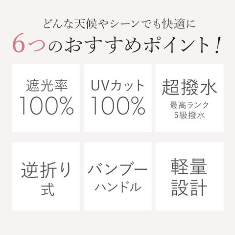 | 商品説明 | 【おしゃれに持ち歩けて機能性も抜群】暑い日のお出かけに、心強い相棒を♪「SAKASA ameri 花びら折りたたみ日傘」。【可愛らしいフラワーシルエット】花びらに包まれるようなデザイン。上品な印象で、華やかな気分に♪【一級遮光で晴れた日の味方】遮光率、UVカット率100%!気になる紫外線をしっかりカット。【まるで日陰のような涼しさを体感】光を反射させて温度の上昇を防ぐ遮熱効果も高く、暑い日の熱中症予防に。(※1)内側ブラックカラーで、照り返しによる肌や目への反射もカットします。【雨粒をサッと弾く超撥水加工】撥水度は最高ランクの5級。雨傘としても使えて、お天気が不安定な日も安心。(※2)激しい雨の際は、雨水が染みることがあるのでご注意ください。【開閉はワンアクションでスムーズ】ポキポキ折らずイージーオープン!濡れた面が内側にくる逆折り式で、雫が飛び散る心配なし。【安心・安全のネイルガード付き】爪や指を挟むのを防止するカバーを装備。開閉時のケガを防ぎ、ネイルを施した爪も保護。【サクッと留められるボタン式バンド】傘生地を留めるバンドは、バチンっと留めやすいスナップボタンタイプ。嬉しい2段階式。【丈夫で風合いのあるハンドル】ナチュラル感たっぷりなハンドル。耐水性があり、雨に濡れても変形しにくいバンブー素材。【ストレスなく持ち歩ける軽量設計】毎日携帯できるよう、軽量化を実現。カバンの隙間にも収まりやすいスリムフォルム。【持ち歩きに便利な収納袋付き】傘生地と同じカラーの収納袋が付属。カバンに忍ばせて、スマートに持ち運び。【バッグのハンドルに取り付けOK】収納袋は片側がナスカンで着脱可能。バッグに装着することもできて便利。【お気に入りを選べるカラー】年代問わず使いやすい、柔らかなカラー。オン・オフ問わず大活躍。 |
