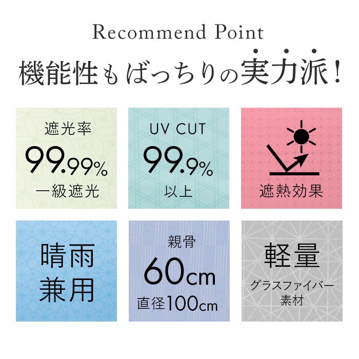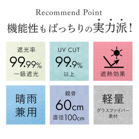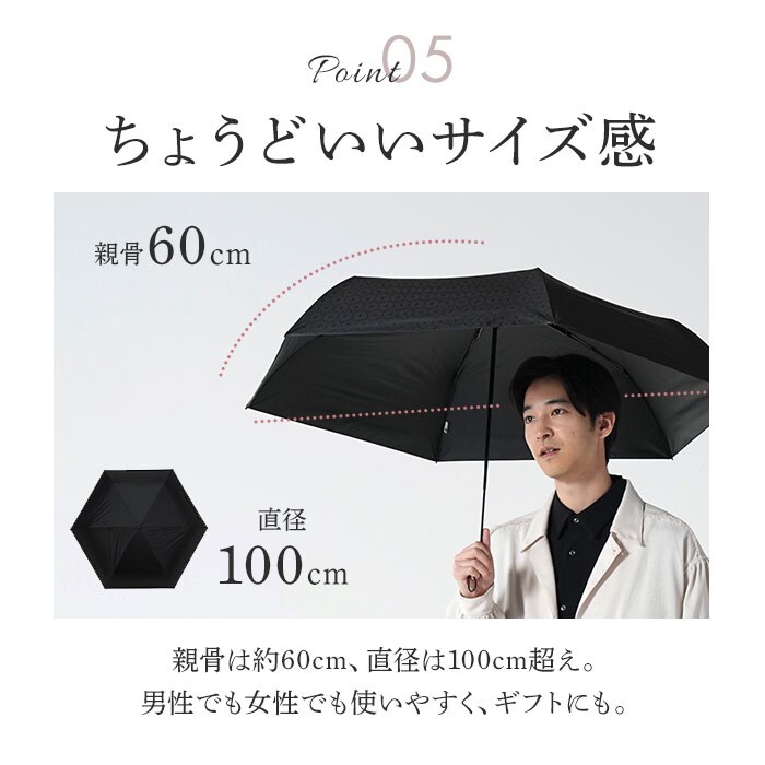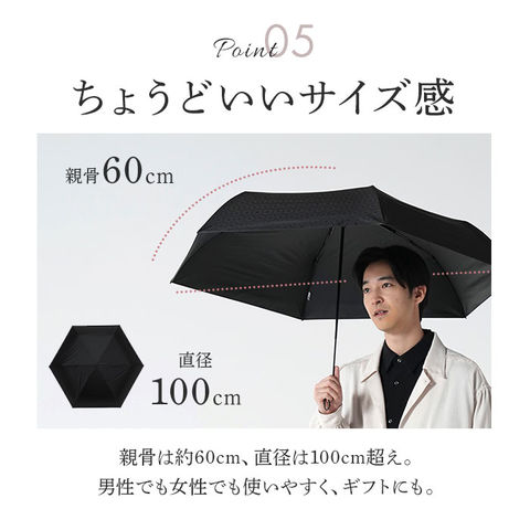 | サイズ | [親骨の長さ]約60cm/[直径]約105cm/[全長]約58cm [収納時の長さ]約26cm [収納時の幅]約5.5cm ※サイズは当店計測の実寸サイズです。実際の商品ならびにメーカー表記サイズとは多少の誤差が生じる場合がございます。あらかじめご了承ください。 |