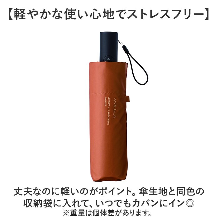 | 商品説明 | 【毎日持ち歩きたいオールウェザー型】機能性と携帯性を追求!開閉も一瞬。mabu ACTIVE AWミニ AUTO50 6本骨【簡単ワンタッチ!片手で自動開閉】手元のボタンを押すだけ、自動開閉機能◎いつでもスムーズに対応、中棒の飛び出し防止機能付。(※1)閉じる際は、中棒を手動で縮める必要があります。【強風や突風にも負けない耐風構造】親骨の一部はしなやかで折れにくいグラスファイバー。風速15m/sに耐えられる丈夫な構造。【高耐水仕様で雨の強い日もOK】雨の浸透を防ぐ、高耐水加工を施した傘。強い雨の日も安心。【一級遮光で晴れた日も味方】遮光率100%、紫外線遮蔽率99.9%以上、UPF50+!光を通さず日差しからガード◎【高い遮熱効果で熱中症から守る】光を反射させて温度の上昇を防ぐ遮熱効果も高く、暑い日の熱中症対策に。【サッとまとまる面ファスナーバンド】傘生地をまとめるバンドは、面ファスナー式。たたむ時も手間取らず、すっきりひとまとめ。【軽やかな使い心地でストレスフリー】丈夫なのに軽いのがポイント。傘生地と同色の収納袋に入れて、いつでもカバンにイン◎(※2)重量は個体差があります。【シーンを選ばないシンプルデザイン】お出かけにも、通勤・通学にも使える仕上がり。色違いで持てるユニセックス仕様。(※3)傘の持ち手には指に掛けられるストラップ付きです。【どんな空の日にもよろこびを】機能・デザイン・ライフスタイル。ありふれた日常にちょっとイイコトを掲げたmabu♪ |
