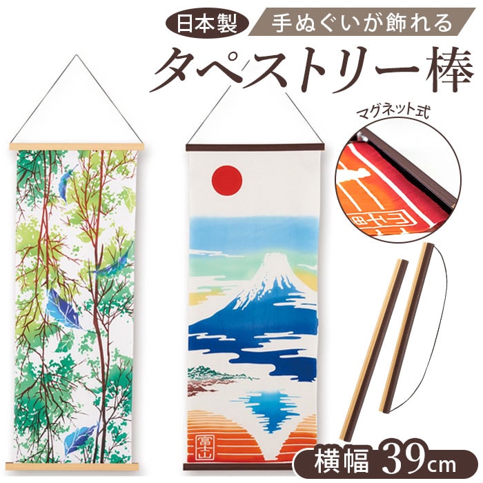 | 商品説明 | 手ぬぐいが飾れる♪マグネット式のタペストリー棒が発売。縦柄の手ぬぐい専用タイプ。マグネット部分を開いて、お手持ちの手ぬぐいを挟むだけのカンタン装着!手ぬぐいのデザインに合わせて表裏を変えて使える、リバーシブル仕様。和風・洋風どちらのインテリアにも対応。季節に合わせて衣替えを楽しめる♪ |