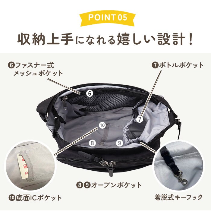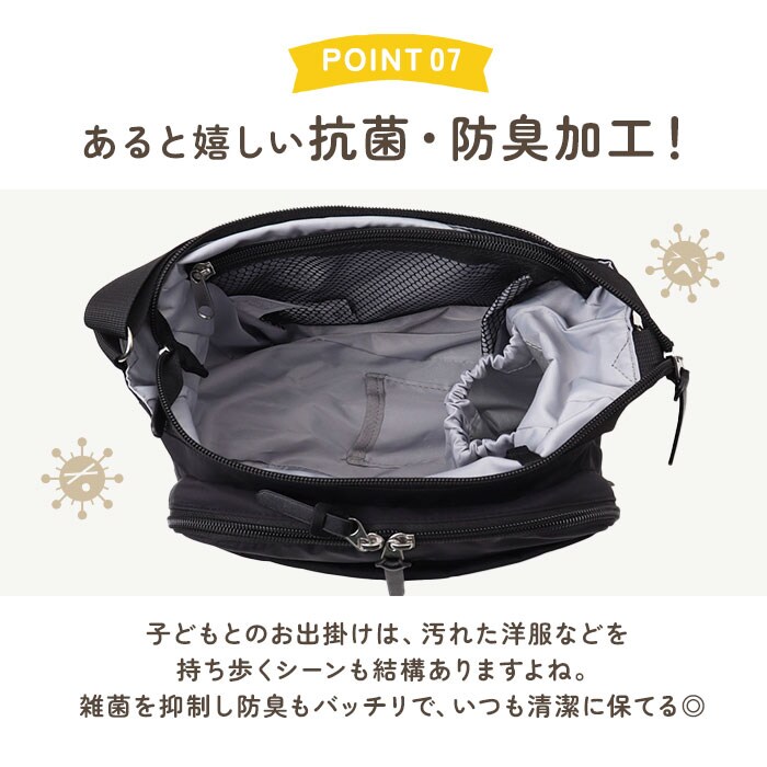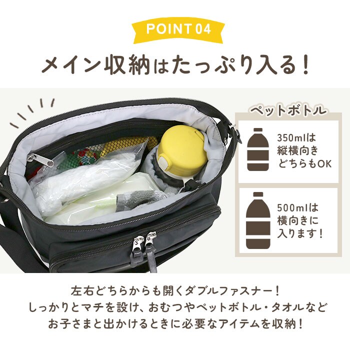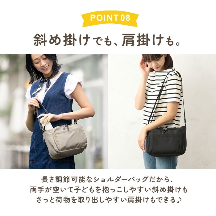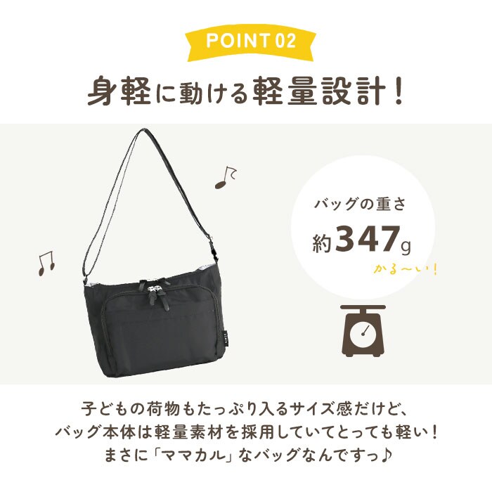 | 商品説明 | 【機能的でお出かけの心強い味方】デイリーに活躍◎ママに優しい機能をギュッと詰め込んだ「ママカル拡張ショルダー」が新登場。【多機能なママカルシリーズ】”ママの負担を軽く”がコンセプト♪シェアしやすいシンプルなデザインと、使いやすさが魅力。【軽やかな使い心地でヘビロテ☆】サッと持ち出せて、体に負担をかけない軽量設計。移動の多い日も疲れを軽減。【両手が空いてストレスフリー】長さ調節可能なショルダーを使って、肩掛けや斜め掛け。アクティブシーンも快適。【ガバっと開くダブルファスナー】左右どちらからもオープン!取り出しやすく、ファスナーを閉じればセキュリティ面も安心。【お子さまのお世話グッズもすっきり】しっかりとマチを設け、おむつやペットボトル、タオルなどを収納可能。(※1)350mlは縦横どちらも。500mlは横向きに収納できます。【ポケットやフック付きで迷子知らず】脱着式のキーフック。底ポケットにICカードをINして、改札のタッチもバッグをかざすだけ。【荷物の量に合わせて簡単に拡張】背面ファスナーをぐるっと開けると、容量がアップ!荷物が増えた時も慌てない♪【充実のお財布機能ポケットを搭載】前面ポケットにはMサイズまでの母子手帳、現金や診察券などのカード類、ペンを収納◎【使用頻度の高い小物もラクラク】最前面と背面にもポケットを配置。サクッと取り出せて、とっても便利。【ちょっとの雨なら大丈夫】表面には水滴や汚れを弾く、撥水加工済み。お手入れも拭き取るだけ。(※2)完全防水ではありません。【抗菌防臭加工でいつも清潔】内装生地に加工を施すことで、バッグ内の気になるニオイを軽減。ニオイの元となる菌もガード。【飽きのこないシンプルデザイン】マットな質感の生地に、無駄な装飾を省いた無地カラー。どんなコーデにも素敵にマッチ。 |