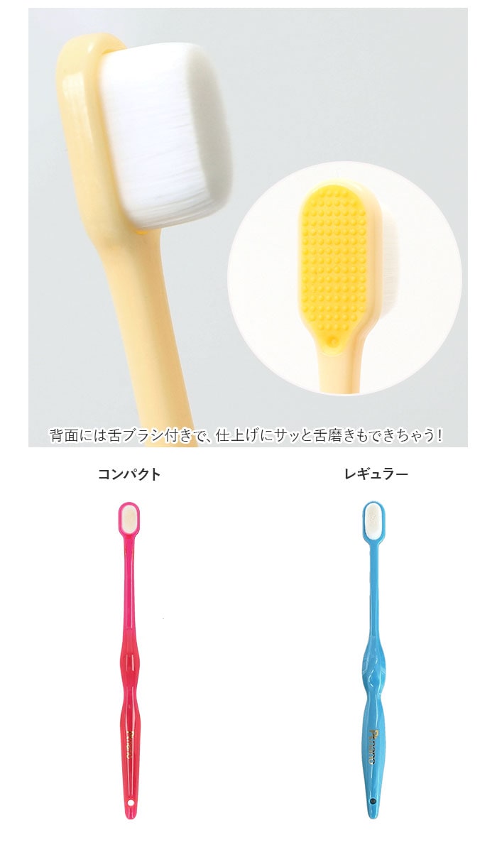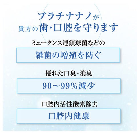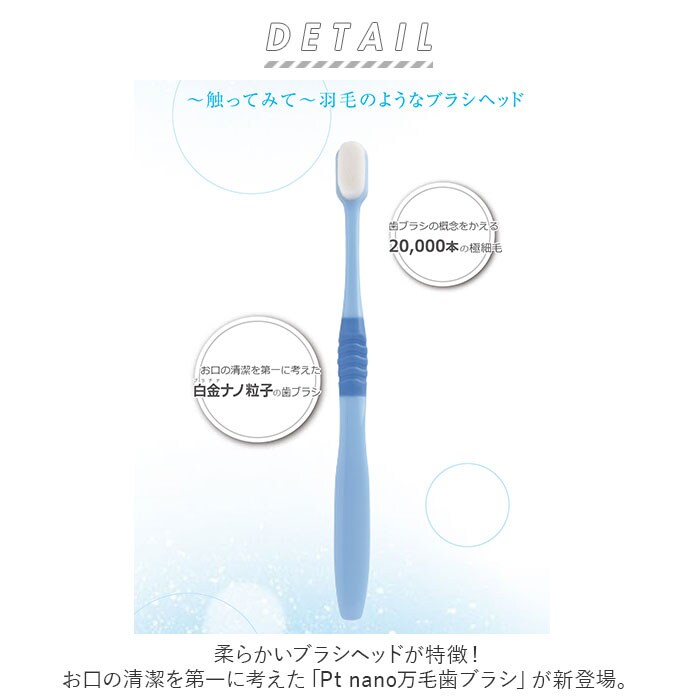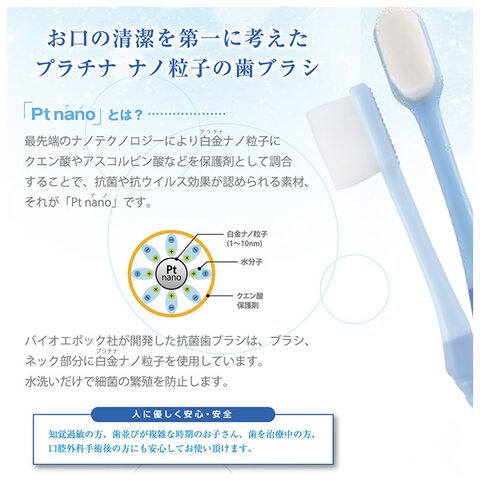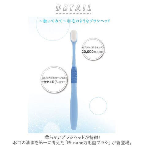 | 商品説明 | 柔らかいブラシヘッドが特徴!お口の清潔を第一に考えた「Pt nano万毛歯ブラシ」が新登場。一般的な歯ブラシの約20倍!筆のような2万本の極細毛にプラチナナノ粒子「Pt nano」加工を施した、持続性と安全性が保障されている歯ブラシ。(※Pt nanoとは、プラチナを4ナノメートルの大きさの粒子にした素材。)・0.08mmの極細毛が歯茎を傷めることなく歯の隙間に入り込み、隅々までブラッシングすることが可能。ネック部分にも「Pt nano」加工済み。水洗いするだけで雑菌の繁殖を抑制し、歯ブラシ全体を清潔に保てるのも嬉しいポイント。背面には舌ブラシ付きで、仕上げにサッと舌磨きもできちゃう!虫歯・口臭・歯周病・粘つき予防など、口腔内全体のケアに最適◎安心の日本製。 |
