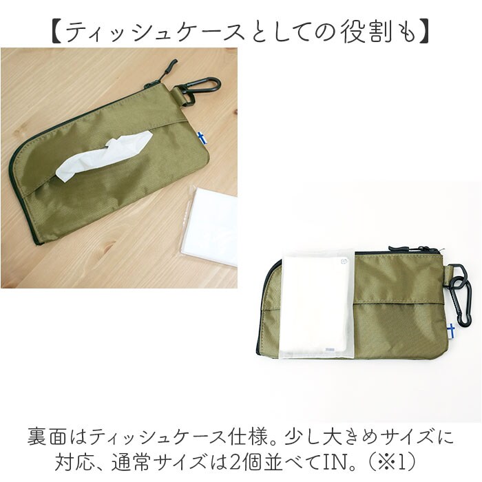 | 商品説明 | 【マスクとティッシュを一緒に】マスクやポケットティッシュの持ち歩きに。「KAKSI ティッシュケース付きマスクポーチ」【ガバっと開くL字ファスナー】開口部はL字型にオープン。出し入れがとってもスムーズで、ストレスフリー◎【ストックしたり一時保管に便利】内側には仕切り付き。ストックマスクを入れたり、外したマスクの一時保管など仕分けOK。【通常サイズが折らずにすっぽり】小さめや通常サイズのマスクはそのままで。立体や大きいサイズは折った状態で。【消臭・抗菌効果で衛生的】仕切りの手前側には消臭・抗菌効果のあるデオドラントネーム。菌の繁殖を防ぎ、不快臭を減少。【ティッシュケースとしての役割も】裏面はティッシュケース仕様。少し大きめサイズに対応、通常サイズは2個並べてIN。(※1)2個並べた場合は取り出し口が逆になるため、少し出しずらくなります。【ディテールにもこだわりをプラス】本体と色味を変えた内生地。フロントのネームワッペンやロゴもアクセント☆(※2)カラーにより内生地の色が異なります。【バッグやベルトループに取り付け】ワンタッチで装着できるカラビナ付き。わかりやすい場所に取り付けておけば、迷子知らず。【お揃いで持てるユニセックス仕様】シンプルなデザインと、使いやすいスタンダードカラー。家族やパートナーとお揃いに♪【KAKSIとは】フィンランド語で数字の”2”を意味する言葉。1番大切な日常のすぐ隣に寄り添えますように。【ポケット仕様】背面:ティッシュポケット×1 |