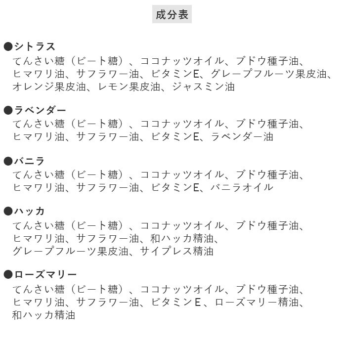 | 注意点 | 食用ではありません。直射日光を避け涼しい所で保管下さい。お肌にあわないときはご使用を中止して下さい。使用方法を守って下さい。高温・多湿・直射日光を避け、涼しい所で保管して下さい。本品に水が入ると砂糖が溶けて固まる恐れがありますので、水が入らないようにご注意下さい。オイルがもれる可能性がありますので、容器を倒したり傾けた状態で放置しないで下さい。フタを開けて放置するとアリなどが寄って来る可能性がありますので、必ずフタをして下さい。温度変化により、まれにオイルが下部に沈む場合がありますが、品質には問題ありません。フタをしたまま容器ごと軽く振って混みて下さい。容器が溶ける場合がありますので、火の近くに置かないで下さい。乳幼児の手の届かない所に保管して下さい。カメラやモニターの性質により、画像と実物の色の違いがある場合がございますのでご理解願います。 |