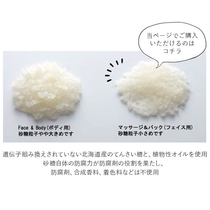 | 商品説明 | 100%食用由来の天然成分配合、朝晩毎日使える無添加スキンケア♪「スイーツスキンケア シュクレ マッサージ&パック 100g」が登場。遺伝子組み換えされていない北海道産のてんさい糖と、植物性オイルを使用。砂糖自体の防腐力が防腐剤の役割を果たし、防腐剤、合成香料、着色料などは不使用。100%食品由来の天然成分だから、万が一口の中に入っても安心◎使い方はカンタン、濡れたお肌に優しく馴染ませてサッと洗い流すだけ♪全身に使うことができるのも魅力の1つ。てんさい糖がお肌の水分と皮脂のバランスを整え、しっかりと保湿!さらにてんさい糖1粒1粒にコーティングしたオイルが、クッションの役割を果たすことで肌への刺激が少なく、敏感肌の方でも安心して使えるのが嬉しい。天然精油配合の5つの香りをラインナップ!シトラス…もぎたてのフルーツのようなみずみずしい、甘い柑橘系の香り。ラベンダー…気分をリラックスさせ、安眠効果もある北海道代表の香り。バニラ…遊び心を感じさせる甘い香り。ハッカ…さっぱり気分でリフレッシュできる、ひんやりとした清涼感のある香り。ローズマリー…すーっと染みわたるような清涼感のある香り。 |