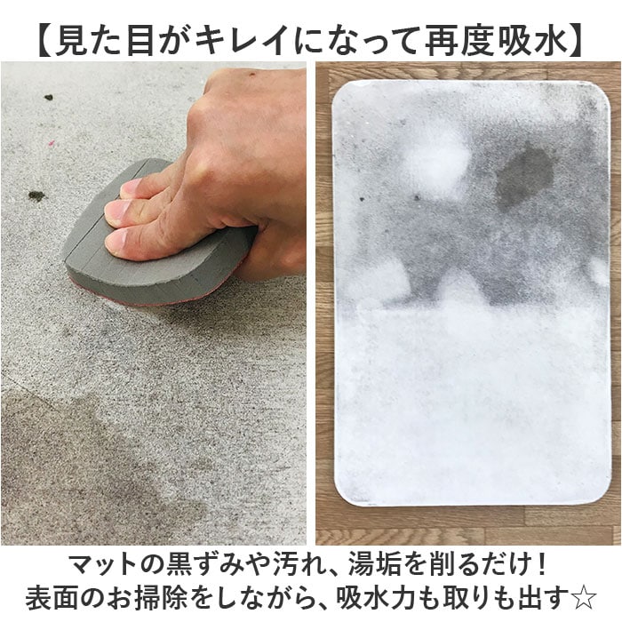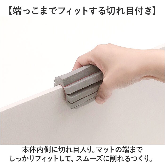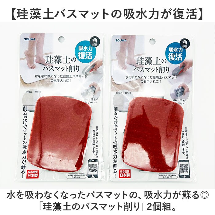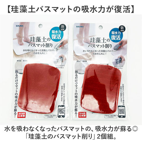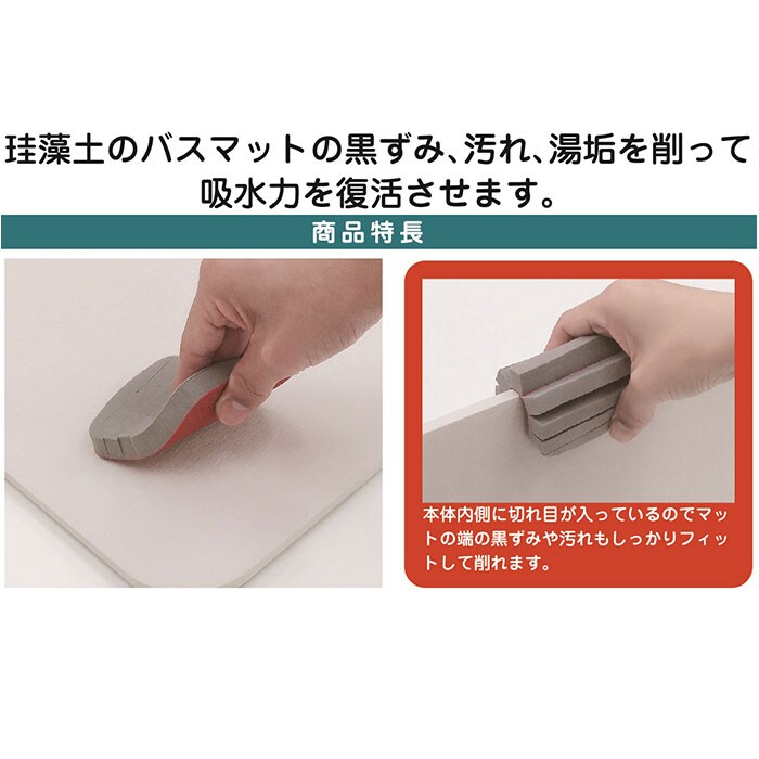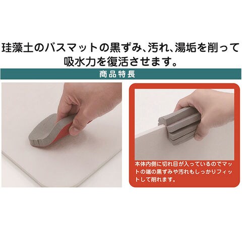 | 商品説明 | 【珪藻土バスマットの吸水力が復活】水を吸わなくなったバスマットの、吸水力が蘇る◎「珪藻土のバスマット削り」2個組。【見た目がキレイになって再度吸水】マットの黒ずみや汚れ、湯垢を削るだけ!表面のお掃除をしながら、吸水力も取りも出す☆【端っこまでフィットする切れ目付き】本体内側に切れ目入り。マットの端までしっかりフィットして、スムーズに削れるつくり。【水洗いし、繰り返し使えて便利】目詰まりしたヤスリ部分は、水洗いして乾かせば繰り返し活用。お財布にも優しいアイテム♪(※)削った後のヤスリ部分についた削り粉は、水洗いして落とすことができます。【気になった時に手軽に使える】サッと手に取れるコンパクトサイズ。安心の日本製&嬉しい2個セット。 |