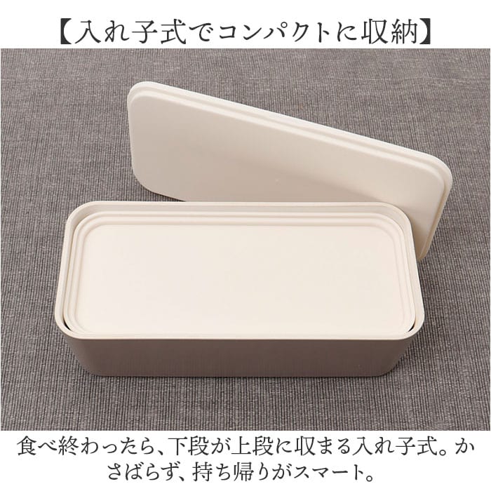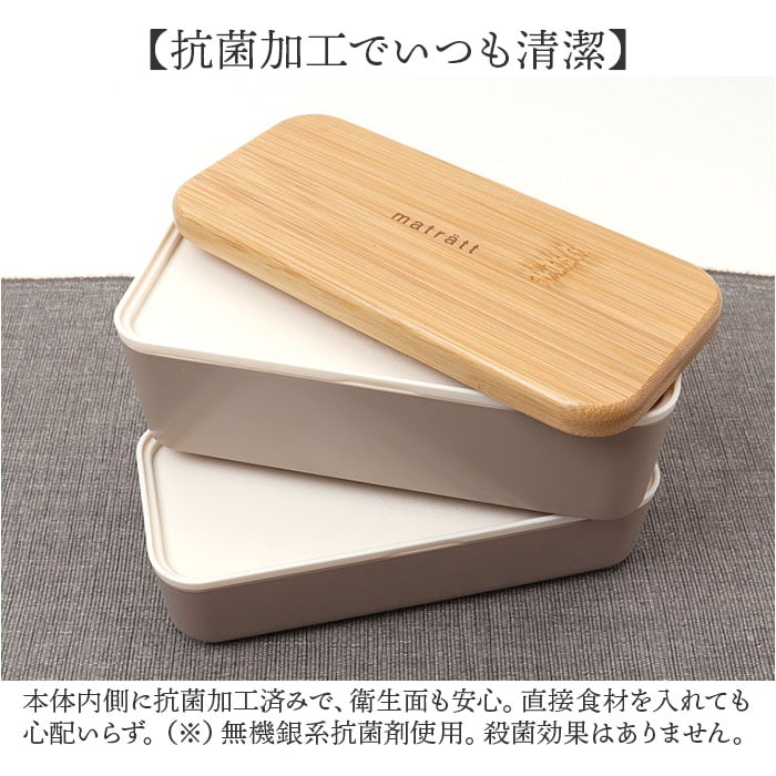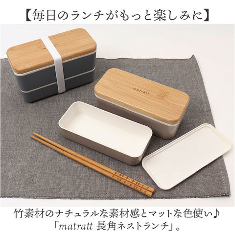 | 商品説明 | 【毎日のランチがもっと楽しみに】竹素材のナチュラルな素材感とマットな色使い♪「matratt 長角ネストランチ」。【北欧テイストの優しいデザイン】ランチライムをおしゃれに彩る☆年代問わず持ちやすい、柔らかなデザインが魅力。【ランチにちょうどいいサイズ感】スリムに積み重ねた2段ランチボックス。容量は上段450ml、下段280ml。【入れ子式でコンパクトに収納】食べ終わったら、下段が上段に収まる入れ子式。かさばらず、持ち帰りがスマート。【レンジ対応!熱々ごはんが復活】フタとシール蓋を外せば、電子レンジでの温めが可能。オフィスでも温かいランチを楽しめる!【食洗機が使えてお手入れラクラク】フタとシール蓋を除いて、食洗機の使用OK。お手入れしやすく、忙しい毎日の味方◎【抗菌加工でいつも清潔】本体内側に抗菌加工済みで、衛生面も安心。直接食材を入れても心配いらず。(※)無機銀系抗菌剤使用。殺菌効果はありません。【しっかりホールドして汁漏れガード】ランチボックスをまとめるバンドが付属。シール蓋とセットで汁漏れを防いで、持ち運びも安心。【お気に入りを選べるカラー】デスクに置くだけで絵になる、柔らかなカラー。家族色違いで揃えるのもおすすめ。【matratt-モースレ】スウェーデン語で、「お皿」の意。食器のようなデザインで、ランチを美味しく召し上がれ♪ |