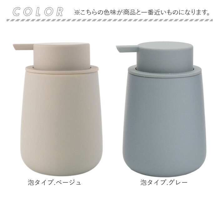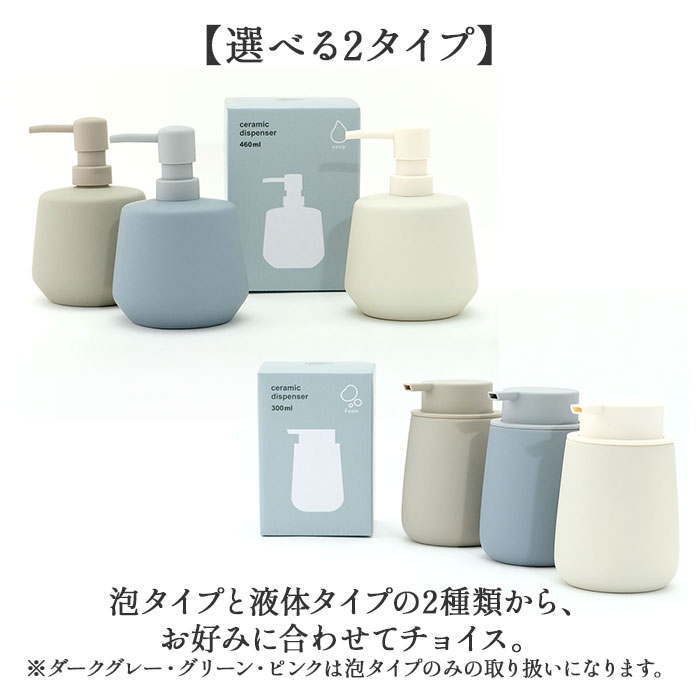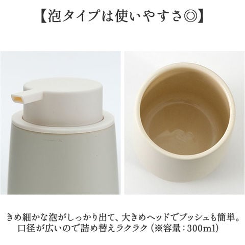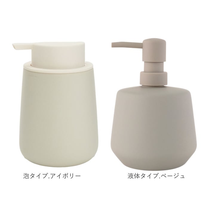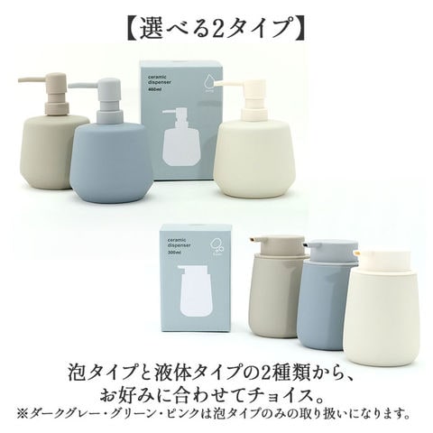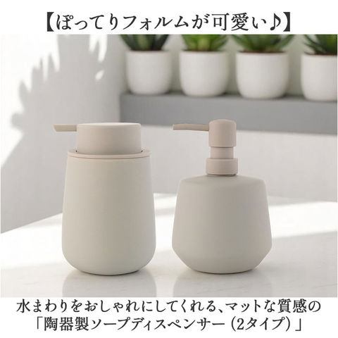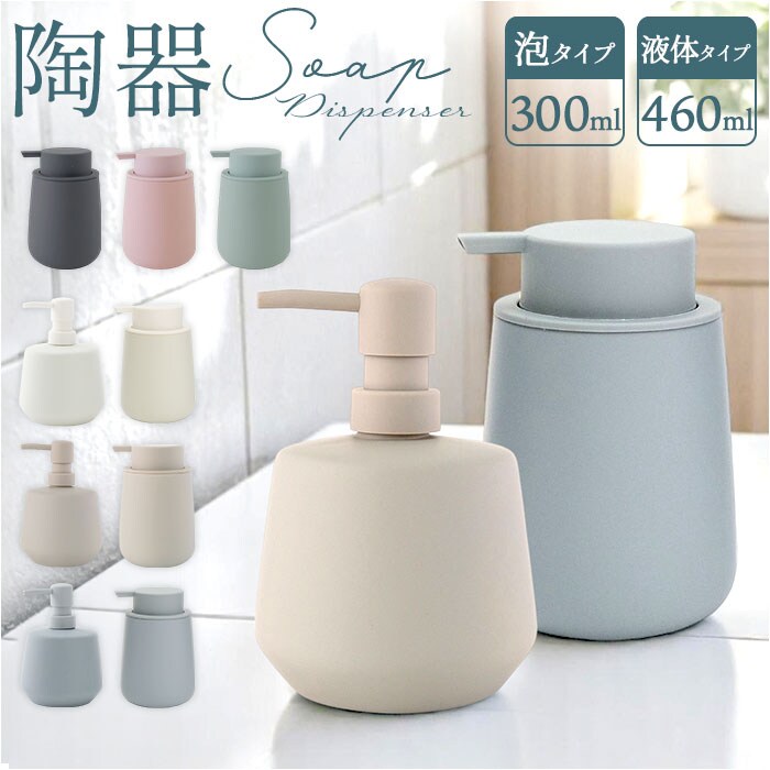 商品説明【ぽってりフォルムが可愛い♪】水まわりをおしゃれにしてくれる、マットな質感の「陶器製ソープディスペンサー(2タイプ)」【ラバー加工で滑りにくい】陶器の表面にラバーコーティングを施すことで、滑りにくく手にフィット。クッション性も◎【選べる2タイプ】泡タイプと液体タイプの2種類から、お好みに合わせてチョイス。【泡タイプは使いやすさ◎】きめ細かな泡がしっかり出て、大きめヘッドでプッシュも簡単。口径が広いので詰め替えラクラク(※容量:300ml)【液体タイプは大容量】たっぷり使える460mlの大容量タイプ。詰め替え頻度が少なくて済むのも嬉しいポイント!【インテリアに馴染むシンプルデザイン】どんな空間にもなじむ、シックな色合い。おしゃれな暮らしが好きな方へのギフトにもぴったり。