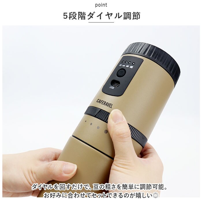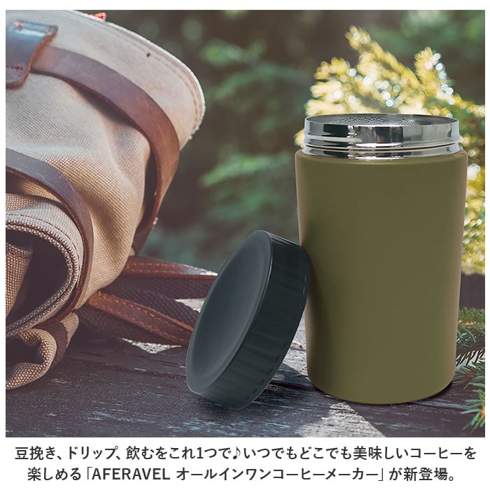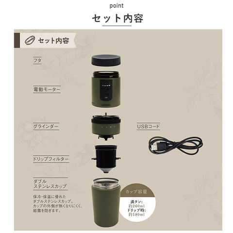 | 商品説明 | 豆挽き、ドリップ、飲むをこれ1つで♪いつでもどこでも美味しいコーヒーを楽しめる「AFERAVEL オールインワンコーヒーメーカー」が新登場。【便利なオールインワンタイプ】電動で豆を挽き、お湯を入れてドリップしたら、美味しい挽き立てコーヒーの完成☆カップでそのまま飲めちゃう、全工程対応の優れもの!【5段階ダイヤル調節】ダイヤルを回すだけで、豆の粗さを簡単に調節可能。お好みに合わせてセットできるのが嬉しい◎【ダブルステンレスカップ】カップ部分は、保冷・保温性に優れたダブルステンレス仕様。カップの外側が熱くなりにくく、冷たさで結露する心配もなし!(※容量は満タン時:約260ml、ドリップ時:約180ml)【便利なUSB充電式】使用時は電源コード不要のUSB充電タイプ。充電残量がひと目でわかるランプを搭載。(※約2.5~3時間満充電で、約30分稼働。使用環境などにより異なります。)【場所を選ばず様々なシーンで】コーヒー豆とお湯さえあればOKなので、キャンプなどのアウトドア、オフィスでも活躍。【誰でも使いやすいカラーバリエーション】マットな質感&落ち着きのあるカラー。お気に入りをチョイスして♪【セット内容】フタ、電動モーター、グラインダー、ドリップフィルター、ダブルステンレスカップ、USBコード |