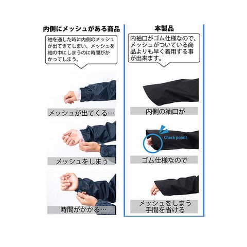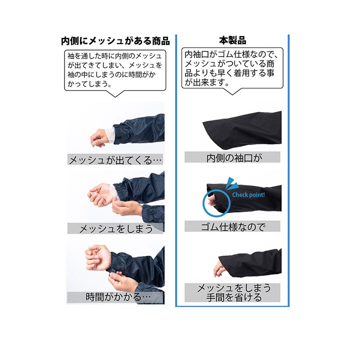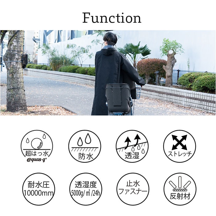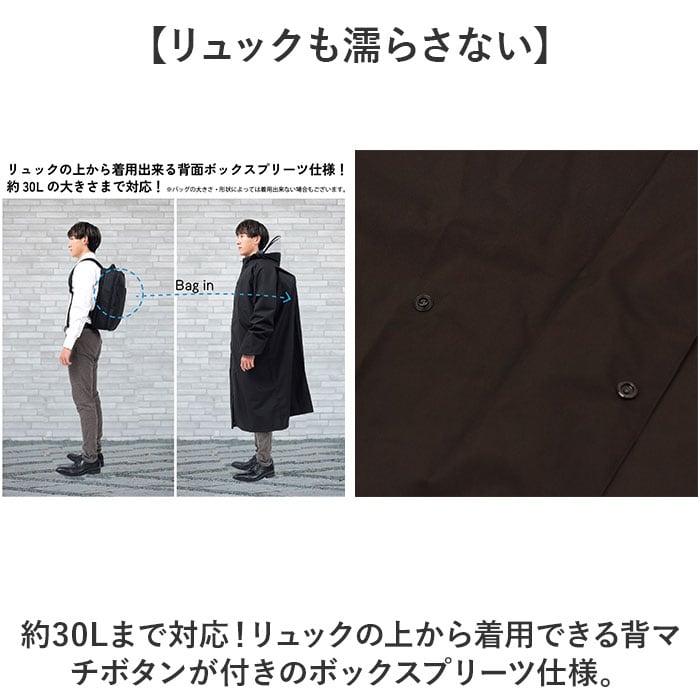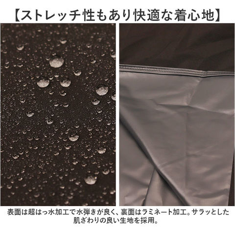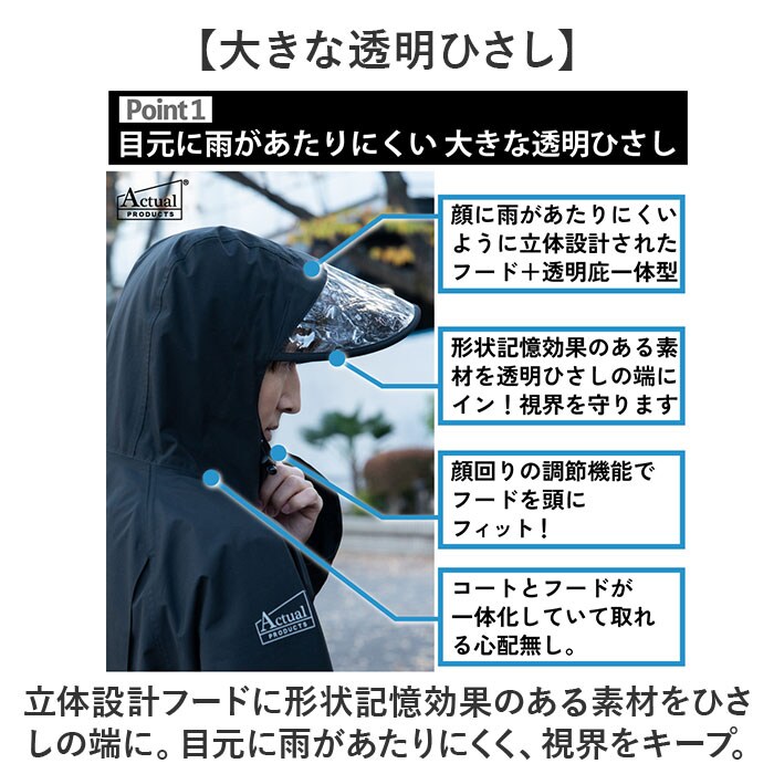 | 商品説明 | 【忙しい時にサッと着用!】自転車を使う男性に最適なレインコート「Actual Product メンズサイクルコート」が登場。【着用の時短に!】コートを着て、ファスナーを締め、フードを被るだけ!憂鬱な雨の日の負担を軽減。【大きな透明ひさし】立体設計フードに形状記憶効果のある素材をひさしの端に。目元に雨があたりにくく、視界をキープ。【ヘルメットの着用もOK!】フードはコートと一体化しているので、外れる心配なし!フードの上からヘルメットの着用もOK!【顔まわりにもしっかりフィット】顔回りのドローコードはサイズ調節可能なので雨の浸入をしっかりガード。【二重袖で雨冷え対策】内側の袖はゴム仕様、外側は大きな袖になっている二重袖構造。ハンドルごと覆えて雨冷え予防に。【自転車に乗りやすい】長めの着丈ながらも、足さばきを妨げないよう裾幅がやや広く、フロントにスリットが入ったデザイン。【リュックも濡らさない】約30Lまで対応!リュックの上から着用できる背マチボタンが付きのボックスプリーツ仕様。【ざっくりまとめて収納】レインコートと同じ生地を使用した大きな収納袋付き。雨で濡れたコートの収納も楽々!【反射材付きで安全走行】右袖部分には反射材が付いているので、車からの視認性が高くなり安全を確保。【止水ファスナーで浸み込み軽減】ファスナー部分は雨水が入るのをしっかり防ぐ止水ファスナー。(※)完全防水ではありません。【便利なファスナーポケット】胸元のファスナーポケットは鍵などの小物入れに便利。【ストレッチ性もあり快適な着心地】表面は超はっ水加工で水弾きが良く、裏面はラミネート加工。サラッとした肌ざわりの良い生地を採用。【シンプルでスタイリッシュ】落ち着いた雰囲気のマットカラー。雨の日もおしゃれなアウター感覚のレインウェア。 |
