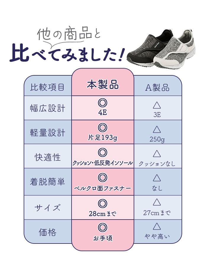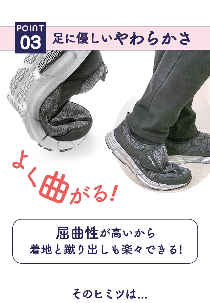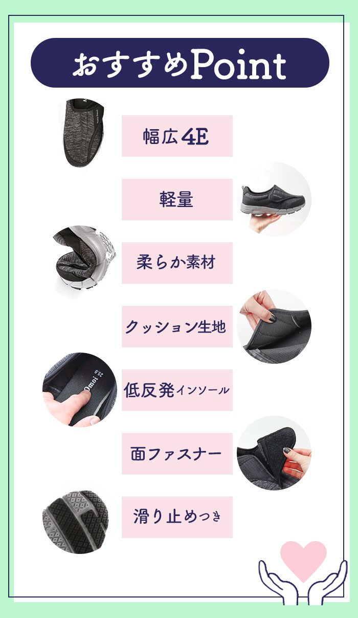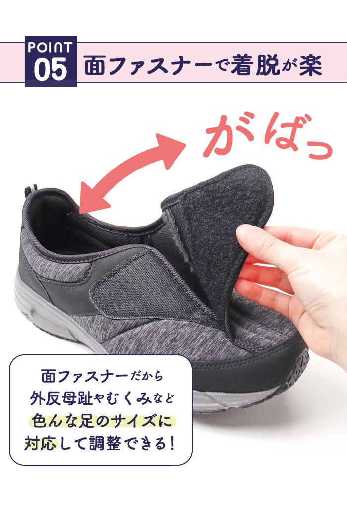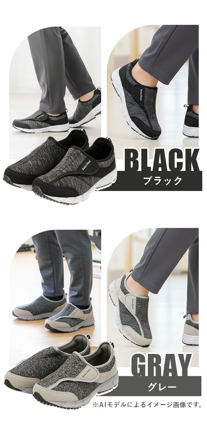 | 商品説明 | 歩きやすさ&履き心地にこだわったメンズスニーカー、「新あなた想い」が新登場!厚めの靴底ソールには、軽量で適度な屈曲性のある合成ゴム底を使用。しっかりとした滑り止め加工で、グリップ感抜群!安定した着地をサポート。足の幅が広めな日本人に合わせた4E幅広設計で、窮屈な締め付け感から解放。さらに足の甲が高めの方でも履きやすいゆったり設計。ベルクロ式(マジックテープ式)で着脱がカンタン!スムーズに脱ぎ履き出来て、ジムやランニング用などスポーツ用にもぴったり。約8mm厚の低反発インソールを使用。かかと部分にもクッション性のある生地を使用して、歩行時の衝撃を和らげて、足や膝への負担を軽減。杢調の合成繊維を使用したアッパーとスタイリッシュなフォルムで、スポーツやウォーキングでの使用はもちろん、カジュアルなファッションにも合わせやすいのが嬉しい。 |