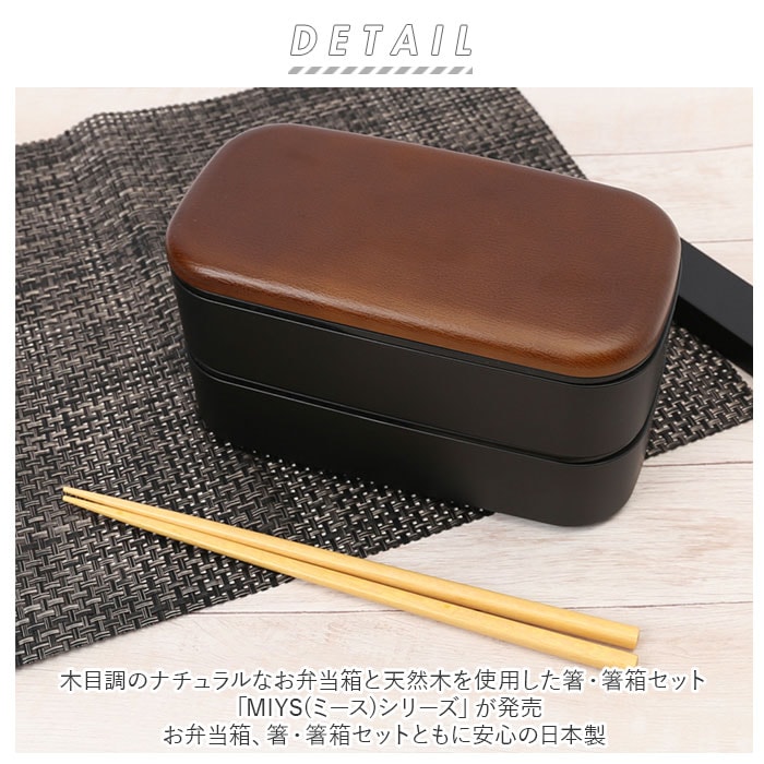 | 商品説明 | 木目調のナチュラルなお弁当箱と天然木を使用した箸・箸箱セット「MIYS(ミース)シリーズ」が発売。・【木目メンズスクウェア弁当 ミース 1000ml】上段500ml+下段500mlの2段式で、総容量1000ml。大容量なので、男性や中高生のお子さまのランチにちょうどいいサイズ感。中ブタ付きだから汁漏れが気になりにくいのもポイント。中ブタを外せば電子レンジや食洗機の使用もOK!持ち運び時に便利なランチバンド付き。・【箸・箸箱セット 22.5cm ミース】天然木を使用したナチュラルな箸「MIYS(ミース)箸・箸箱セット」が発売。箸の長さは約22.5cmと長めなので、男性にも持ちやすいサイズ感。箸箱は出し入れしやすいスライド式。お弁当箱、箸・箸箱セットともに安心の日本製。シンプルな形と落ち着いたカラー。毎日のランチタイムにぴったり。 |