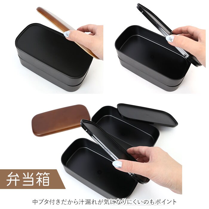 | 素材 | 【弁当箱】 ・素地の種類 [蓋・中段・下段]PET、ABS樹脂 [中蓋]ポリプロピレン ・表面塗装の種類 ウレタン塗装 【箸・箸箱セット】 ・素地の種類 天然木、ABS樹脂 ・表面塗装の種類 [箸]アクリル塗装 [箸箱本体]ウレタン塗装 |