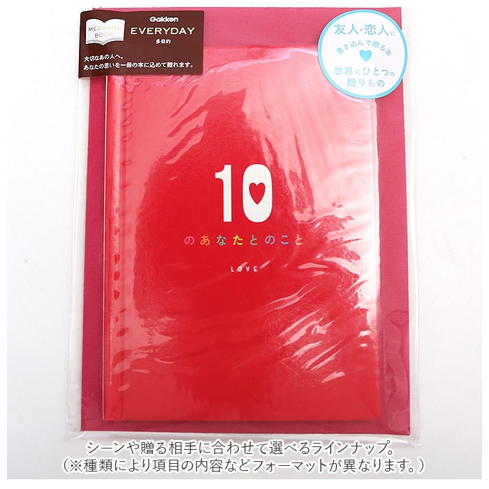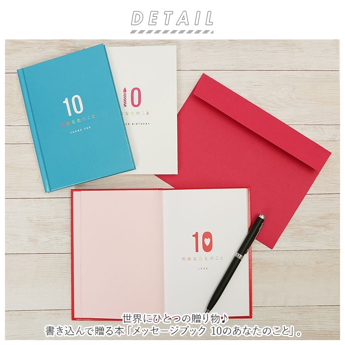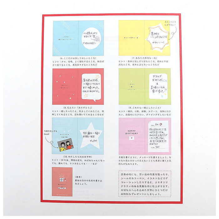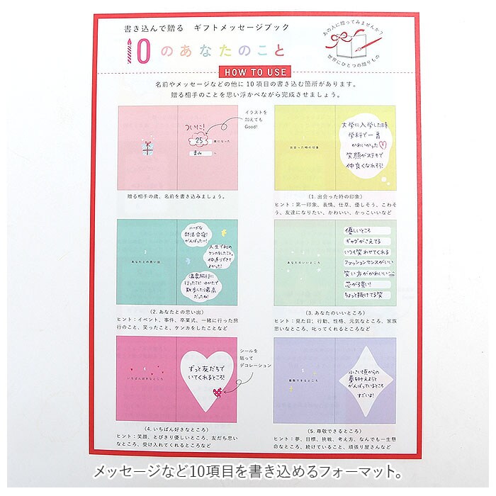 | 商品説明 | 世界にひとつの贈り物♪書き込んで贈る本「メッセージブック 10のあなたのこと」。相手のことを思い浮かべて書き込んでいく、小さな本型のグリーティングカード。メッセージなど10項目を書き込めるフォーマット。封筒付きなので、切手を貼って普通郵便で郵送OK。(※定形外郵便物になるため、料金は郵便局でお確かめください。)あなたの思いを1冊の本に込めて・・・♪シーンや贈る相手に合わせて選べるラインナップ。(※種類により項目の内容などフォーマットが異なります。) |