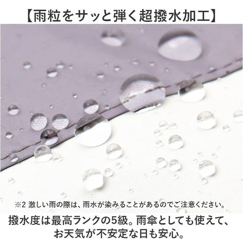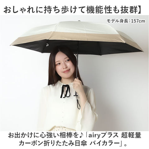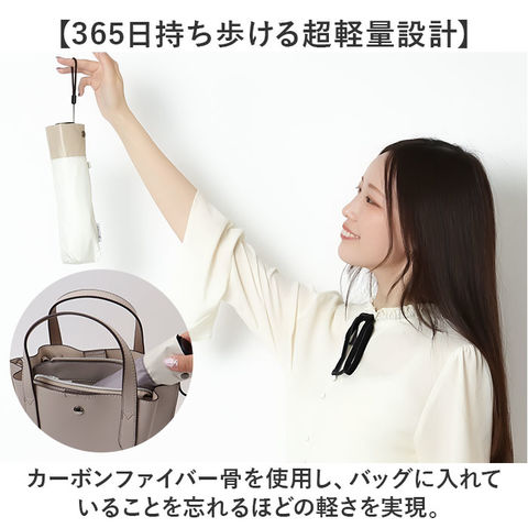| 商品説明 | 【おしゃれに持ち歩けて機能性も抜群】お出かけに心強い相棒を♪「airyプラス 超軽量カーボン折りたたみ日傘 バイカラー」。【365日持ち歩ける超軽量設計】カーボンファイバー骨を使用し、バッグに入れていることを忘れるほどの軽さを実現。【一級の完全遮光で晴れた日の味方】遮光率&UVカット率100%、UPF50+!紫外線をしっかりカット。【まるで日陰のような涼しさを体感】光を反射させて温度の上昇を防ぐ遮熱効果も高く、暑い日の熱中症予防に。(※1)内側ブラックカラーで、照り返しによる肌や目への反射もカットします。【雨粒をサッと弾く超撥水加工】撥水度は最高ランクの5級。雨傘としても使えて、お天気が不安定な日も安心。(※2)激しい雨の際は、雨水が染みることがあるのでご注意ください。【耐久性をアップさせる超高密度生地】細い糸で打ち込まれ、目の詰まった30デニール生地。撥水力を保ちつつ丈夫な仕上がり。【いつでもどこでもイージーオープン】傘骨をポキポキ折る手間なく、スムーズに開閉できる手開き仕様。【耐久性がアップする6本骨】・5本骨より丈夫な6本骨タイプ。一般的な大きさの親骨50cm。【安心・安全のセーフガード付き】爪や指を挟むのを防止するカバーを装備。開閉時のケガを防ぎ、ネイルを施した爪も保護。【強風にも負けず瞬時に元通り】強度の高い親骨。強い風に煽られて反り返ってしまっても、傘を閉じれば元の姿に。【サクッと留められるボタン式バンド】傘生地を留めるバンドは、バチンっと留めやすいスナップボタンタイプ。【持ち歩きに便利な収納袋付き】傘生地と同じカラーの収納袋が付属。カバンに忍ばせて、スマートに持ち歩き。【お気に入りを選べるカラー】年代問わず使いやすい、ナチュラルなバイカラー。オン・オフ問わず大活躍。 |